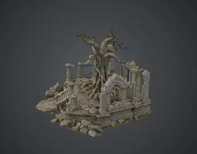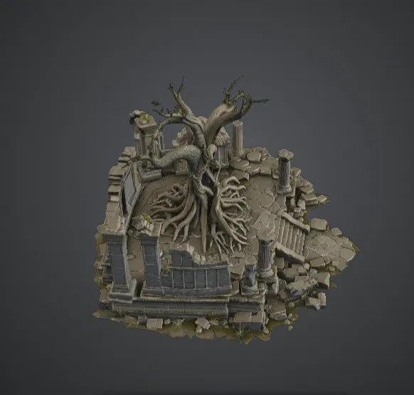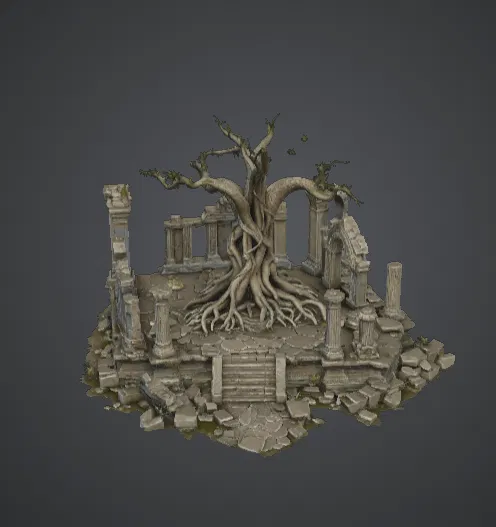 Mô hình Ancient Ruined Tree Temple này tái hiện vẻ đẹp đầy ma mị của thiên nhiên khi bao trùm lấy một nền văn minh đã bị lãng quên. Ở trung tâm là một cây cổ thụ vặn xoắn với bộ rễ đâm xuyên qua tàn tích của một ngôi đền đá tráng lệ ngày xưa. Những cột trụ gãy đổ, những bức tường nứt vỡ và các mảnh vụn nằm rải rác xung quanh gốc cây, tạo nên một khung cảnh đầy ấn tượng về sự tàn phai, lịch sử và những điều bí ẩn.