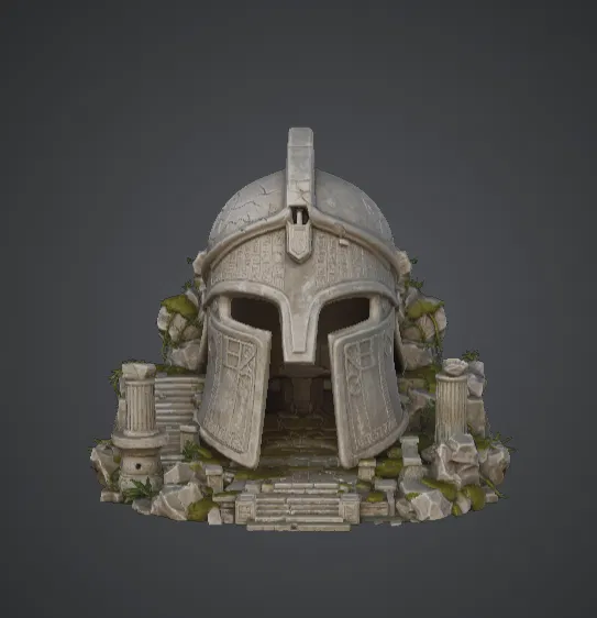 Mô hình Đền Thờ Mũ Chiến Binh Cổ Đại này là một công trình giả tưởng độc đáo, nơi chiếc mũ đá khổng lồ tạo thành lối vào cho một tàn tích bị lãng quên. Chiếc mũ khổng lồ nằm giữa những cột đá đổ nát và các mảnh vụn rải rác, với phần mặt nạ phía trước mở ra để lộ một lối đi bí ẩn dẫn vào bên trong. Một dãy bậc thang đá phong hóa dẫn dắt các nhà thám hiểm tiến vào lối vào, mang lại cảm giác về một ngôi đền cổ kính được xây dựng để tôn vinh một chiến binh hoặc người bảo vệ huyền thoại nào đó trong quá khứ. Mẫu thiết kế này kết hợp các yếu tố kiến trúc mạnh mẽ cùng một ý tưởng giả tưởng đầy ấn tượng, pha trộn giữa những tàn tích cổ điển và một món trang bị giáp trụ mang tính biểu tượng đã được biến thành đài tưởng niệm. Các chi tiết kết cấu đá, bề mặt nứt nẻ và những mảnh vụn phủ đầy rêu phong tạo nên cảm giác cổ xưa và mang đậm hơi thở của lịch sử.