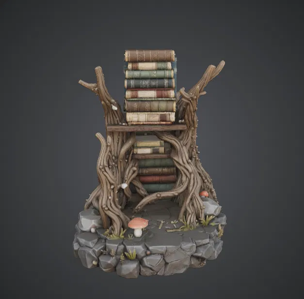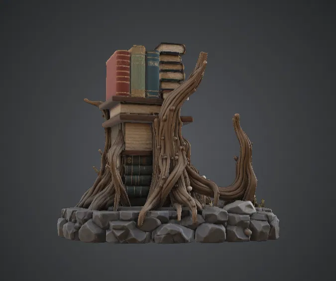 Cấu trúc rễ cây hữu cơ tạo nên một khung đỡ độc đáo cho những cuốn sách, làm cho mô hình trông như một thư viện phép thuật ẩn sâu trong rừng già. Những đường vân gỗ sắc nét, chi tiết vỏ cây và gáy sách chồng lên nhau hứa hẹn sẽ mang đến những trải nghiệm thú vị khi in và sơn màu.