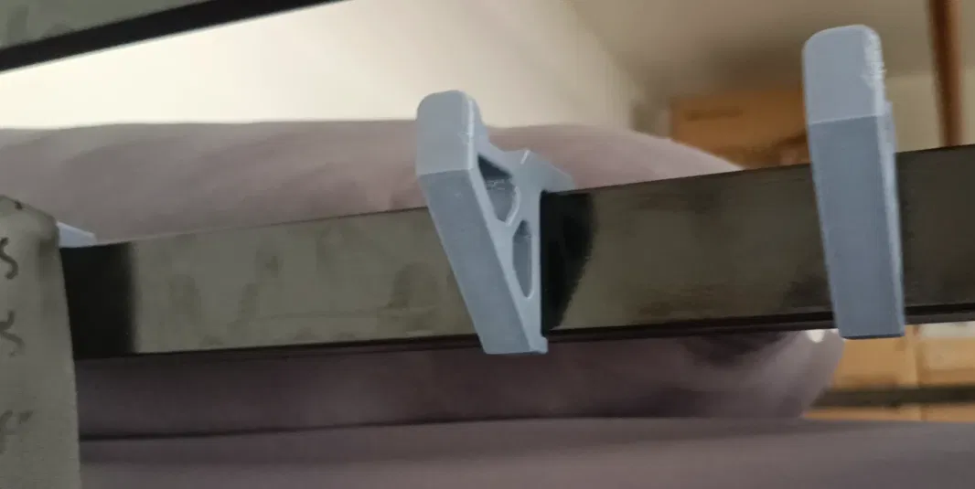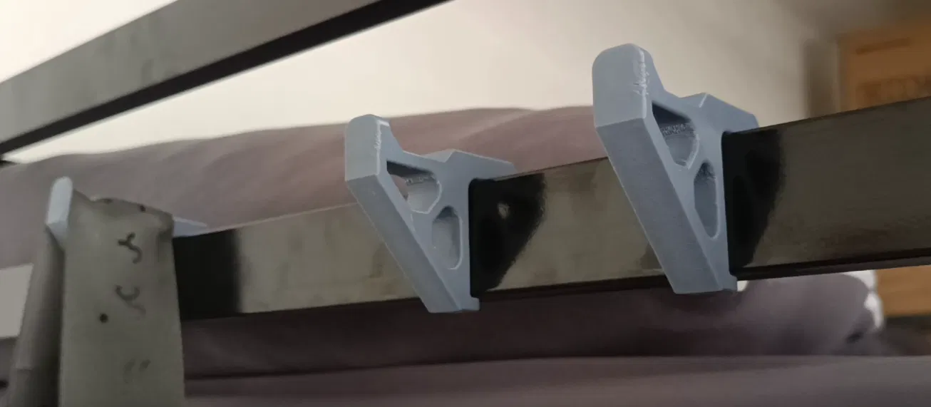 Đây là loại móc treo dạng snap-fit thiết kế cho thanh giường hình chữ nhật. Bạn chỉ cần trượt nó vào ray là móc sẽ tự khóa cố định với một tiếng "tách" cực kỳ đã tai, giữ cho móc chắc chắn mà chẳng cần dùng tới ốc vít hay phụ kiện nào khác.