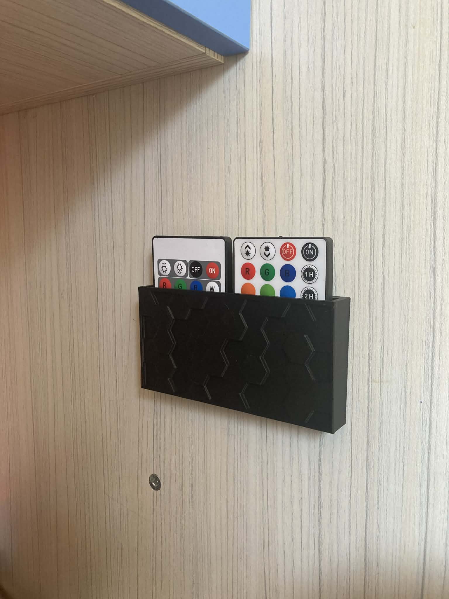 Sản phẩm này được thiết kế theo dạng hộp phẳng, có khả năng chứa cùng lúc hai chiếc remote điều khiển đèn LED tiêu chuẩn. Thiết kế bề mặt phía trước được tạo họa tiết hình học tổ ong (honeycomb) đầy thẩm mỹ, mang lại vẻ ngoài hiện đại và tinh tế cho sản phẩm sau khi in. Bạn hoàn toàn có thể gắn chiếc giá treo này lên tường, cạnh bàn hoặc bất kỳ bề mặt phẳng nào bằng cách sử dụng băng keo hai mặt hoặc keo dán chuyên dụng tùy theo ý thích.