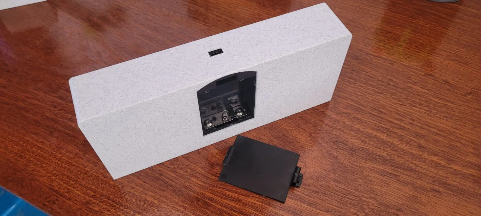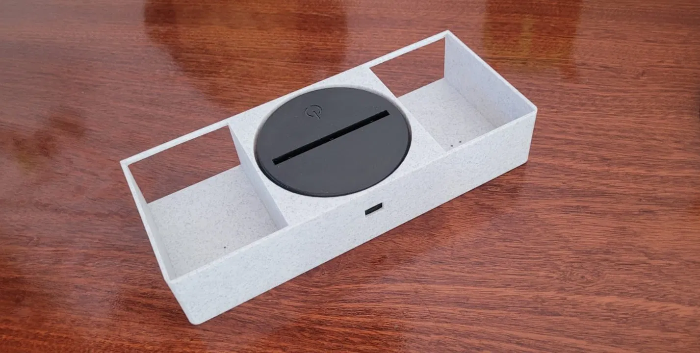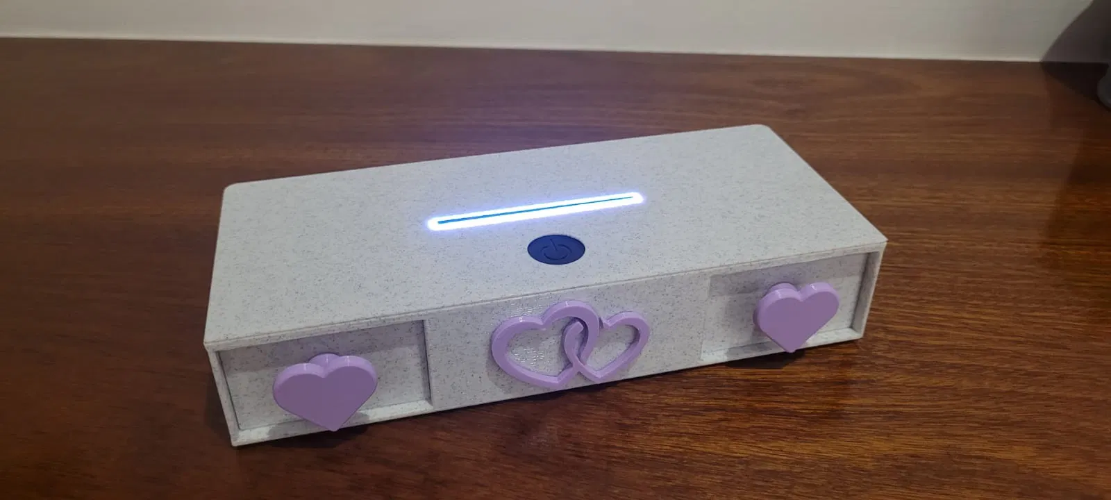 Sau khi in xong phần đế, mình gắn bộ đèn LED vào và cố định bằng keo, nhớ canh chỉnh sao cho phần lắp pin (ở mặt dưới) và cổng cắm USB được vừa vặn, chắc chắn. Cuối cùng, mình dùng keo để gắn các núm vặn vào ngăn kéo, lắp nắp đậy và đính hình trái tim lên để hoàn thiện sản phẩm.