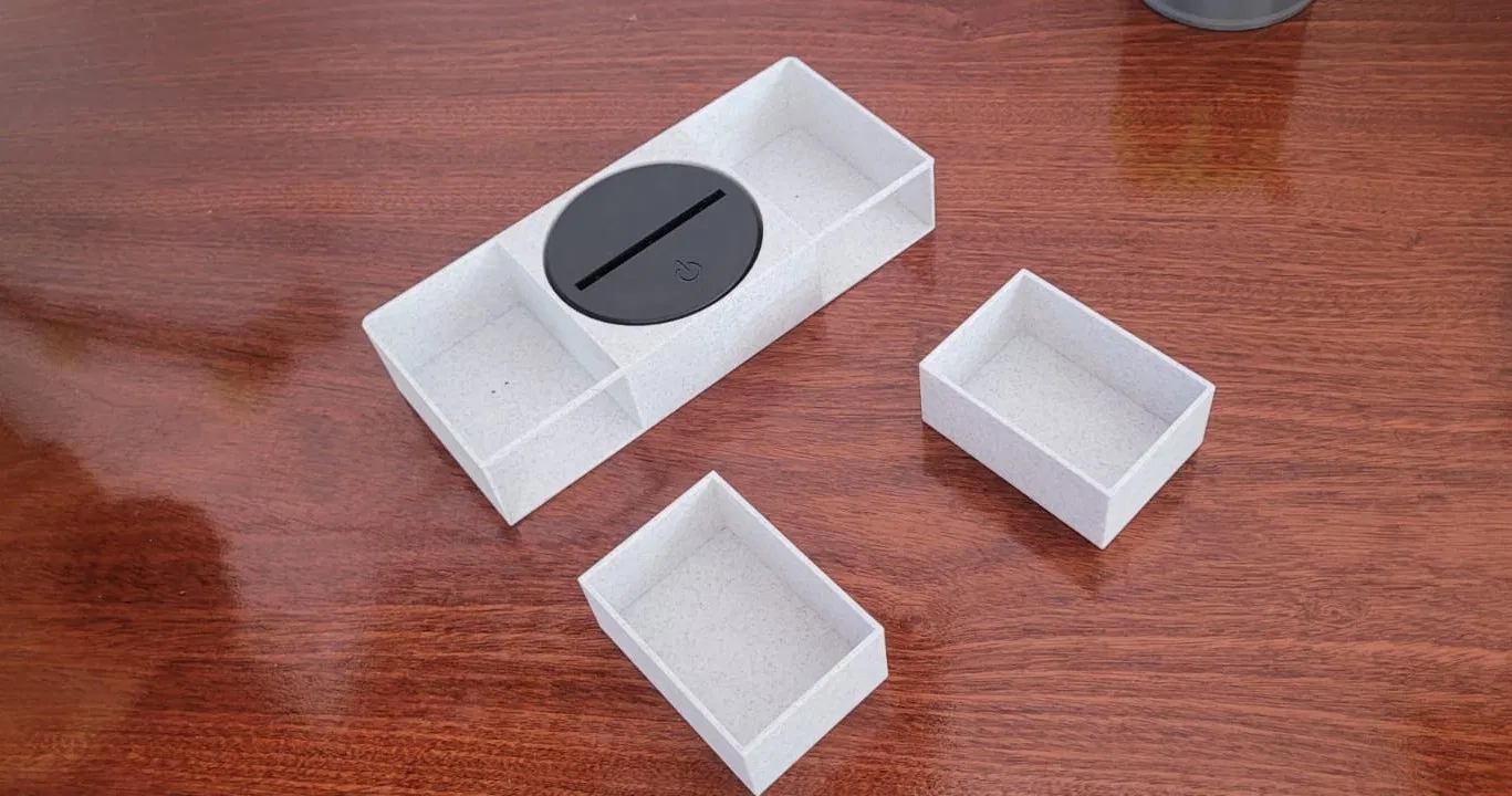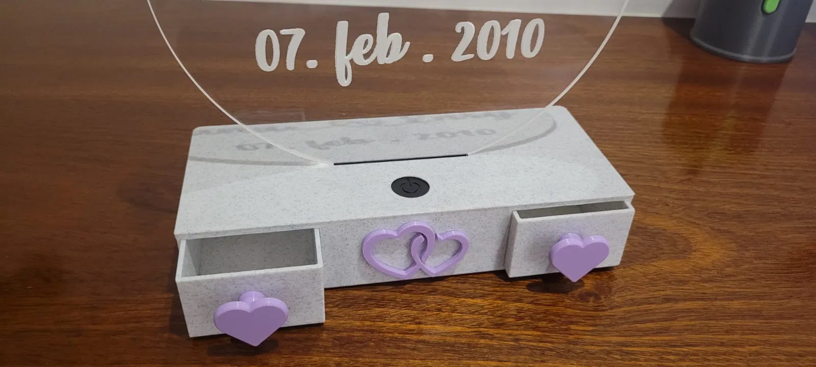 Mẫu đế đèn được thiết kế với hai ngăn kéo tiện lợi và hệ thống đèn LED chiếu sáng cho tấm Acrylic. Mô hình gồm 5 phần dễ in, không cần support, mang tính trang trí cao với điểm nhấn là hai trái tim lồng nhau.