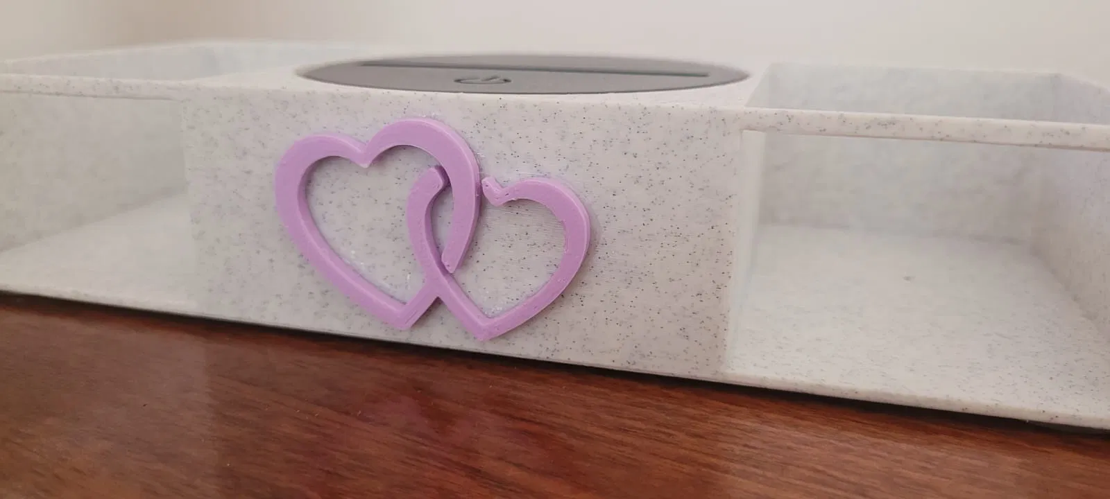 Mình đã thiết kế một chiếc đế đèn có hai ngăn kéo nhỏ ở hai bên và ở giữa là chỗ lắp đèn LED (loại này rất dễ tìm mua trên mạng). Phía trước mình trang trí bằng hình hai trái tim đan lồng vào nhau. Việc in mô hình này gồm 5 phần và hoàn toàn không cần dùng đến support: