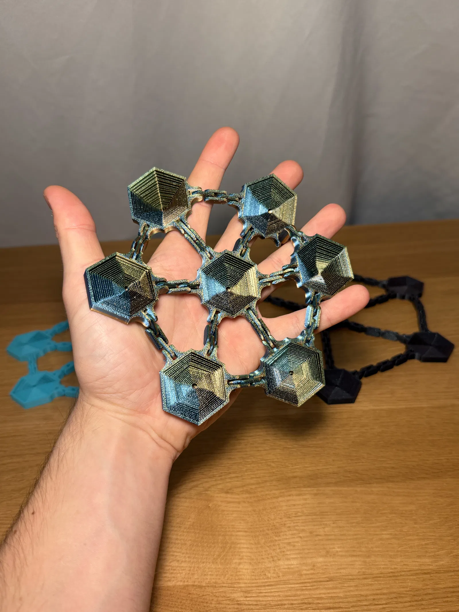 Đây là một món đồ chơi fidget dẻo dai gồm bảy mảnh hình lục giác được nối với nhau bằng các khớp xích linh hoạt. Cấu trúc dạng lưới giúp món đồ này chuyển động, uốn cong, lắc lư một cách thoải mái và cho cảm giác chạm cực kỳ thú vị.
