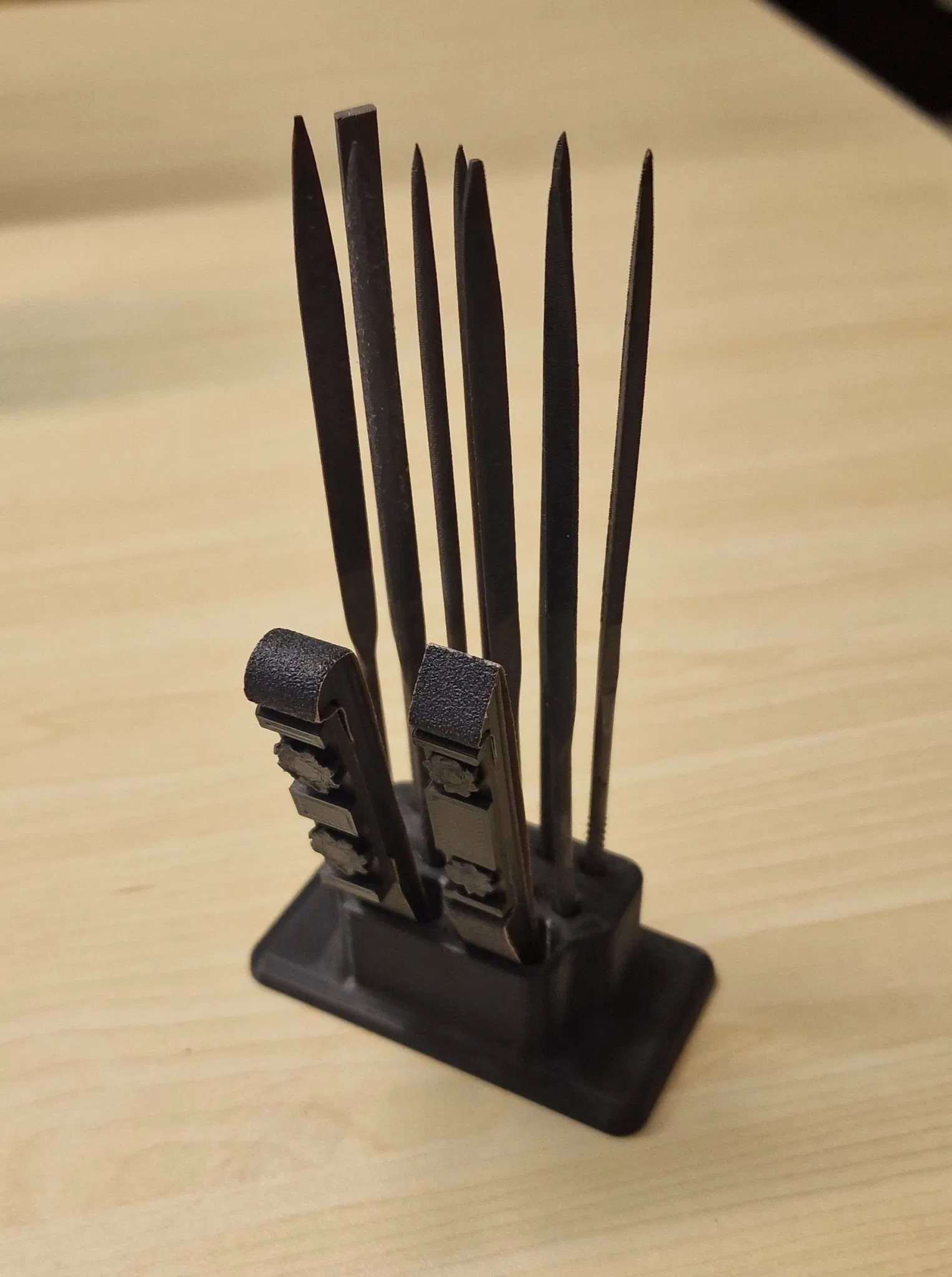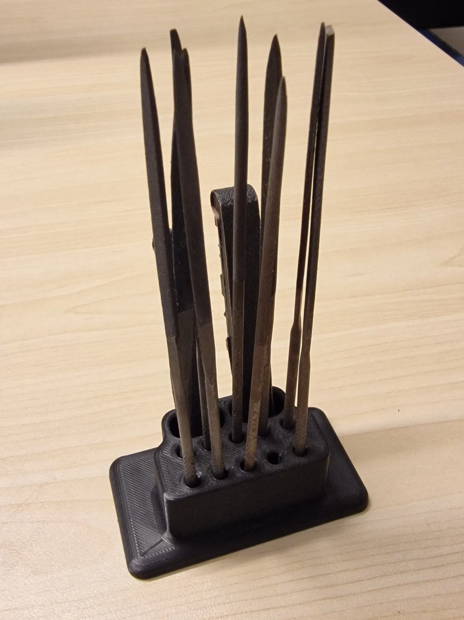 Bàn đứng/giữ cho mười tập tin kim và hai khối chà nhám. Tiện dụng khi thực hiện điều chỉnh trên bản in.