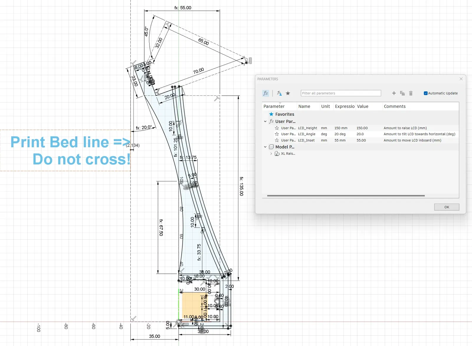 Tôi đã cung cấp tệp Fusion 360 .f3d. Chiều cao để nâng LCD, khoảng cách để di chuyển LCD vào bên trong, và góc để xoay màn hình về phía ngang (từ 45° ban đầu) đều được tham số hóa.