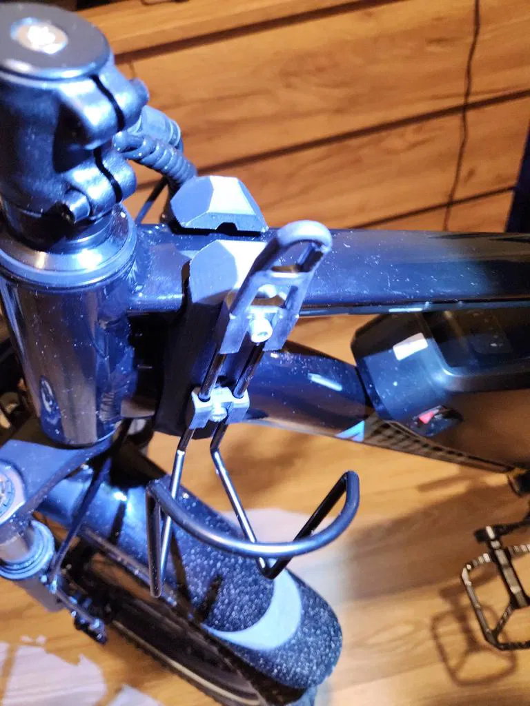 Đây là giá đỡ kẹp từ hai bên nằm ở khung trước của xe đạp gần ghi đông. Giá đỡ có các lỗ gắn M5 cách nhau 64mm, phù hợp để gắn giá đỡ bình nước hoặc các phụ kiện khác.
