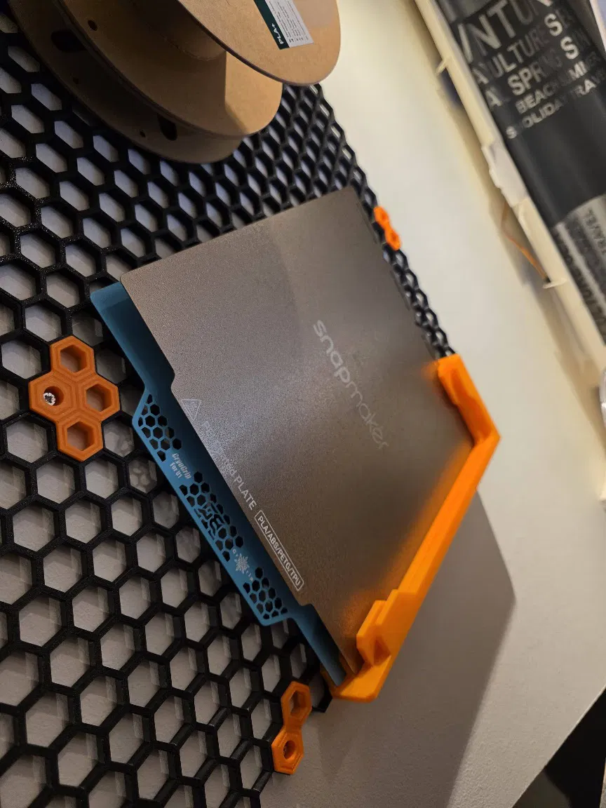 Nếu bạn đang sở hữu một chiếc máy in Snapmaker U1 và cảm thấy bàn in của mình đang chiếm quá nhiều diện tích trên bàn làm việc, thì đây chính là giải pháp dành cho bạn. Mẫu thiết kế này là một chiếc giá đỡ chuyên dụng, được tối ưu hóa để gắn trực tiếp lên hệ thống tường lỗ tổ ong (Honeycomb Storage Wall) cực kỳ phổ biến trong cộng đồng DIY hiện nay. Thay vì để bàn in nằm lung tung, bạn có thể treo gọn gàng chúng lên tường, giúp không gian làm việc trở nên ngăn nắp và chuyên nghiệp hơn hẳn.