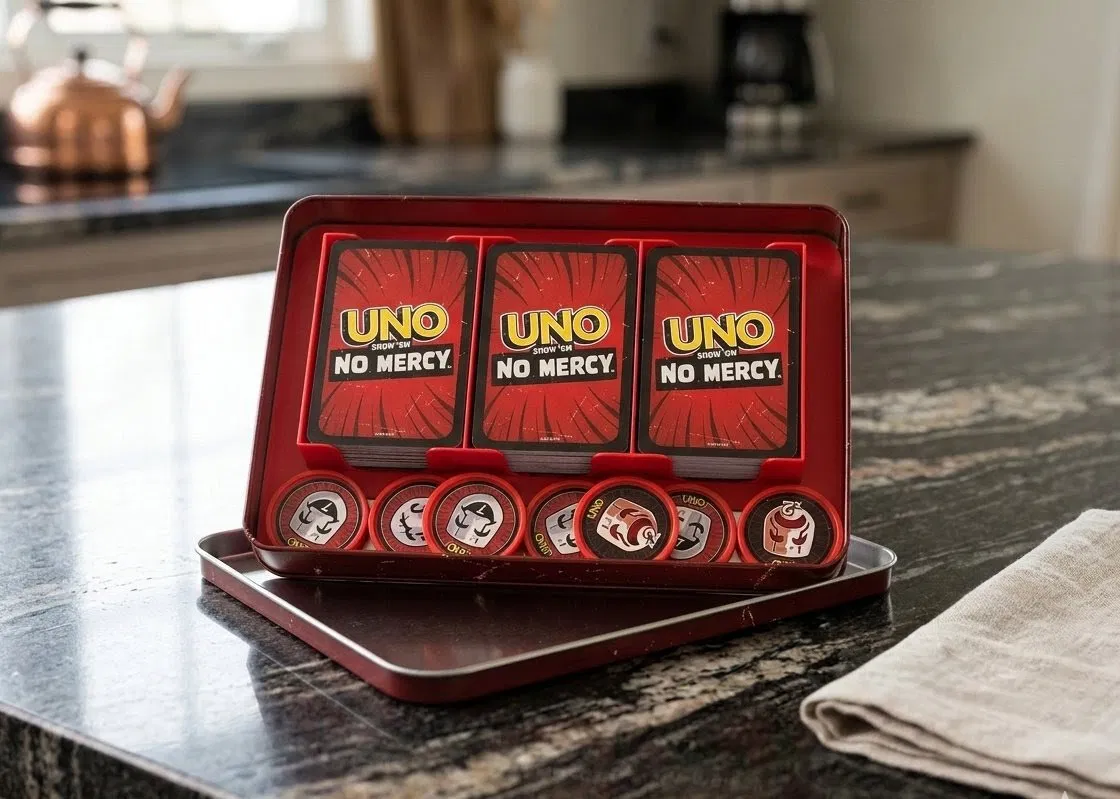Đây là mẫu khay nhựa được thiết kế riêng để đựng bộ bài UNO Show 'em No Mercy. Bao bì gốc của bộ bài thường gây khó khăn trong việc sắp xếp, đặc biệt là khi bạn có thêm các gói mở rộng. Khay này giúp chia bộ bài thành ba ngăn gọn gàng và có khu vực riêng để cất giữ các token mở rộng.