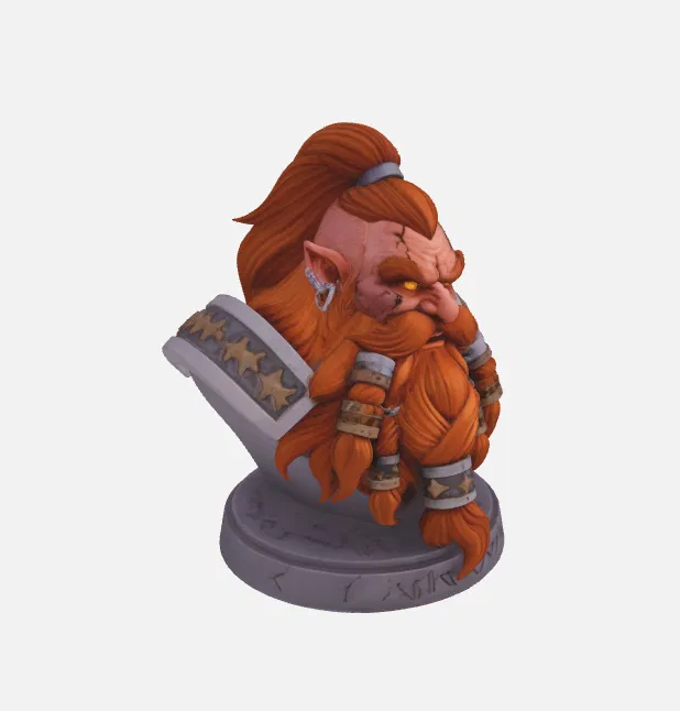 Nếu bạn là người đam mê các trò chơi nhập vai hoặc yêu thích phong cách giả tưởng, mô hình tượng bán thân (bust) nhân vật chiến binh lùn với bộ râu ấn tượng này chắc chắn sẽ làm bạn hài lòng. Đây là một tác phẩm được thiết kế tinh xảo, thể hiện rõ nét sự mạnh mẽ và cứng cáp của nhân vật thông qua các chi tiết như bộ râu được tết tỉ mỉ với những vòng kim loại trang trí, cùng đôi mắt rực lửa toát lên vẻ hung hãn đầy khí chất.