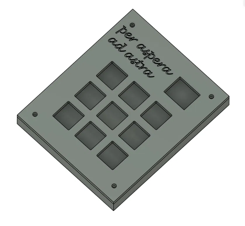 Thiết kế của vỏ tập trung vào sự tối giản nhưng vẫn đảm bảo độ bền cao, giúp bảo vệ các linh kiện bên trong khỏi bụi bẩn và va chạm vô tình. Anh em có thể dễ dàng lắp ráp mọi thứ chỉ với vài con ốc M3 thông dụng, giúp tiết kiệm thời gian mà vẫn đảm bảo sự chắc chắn cho bàn phím phụ. Mặt trên còn được khắc laser dòng chữ truyền cảm hứng "per aspera ad astra", tạo nên điểm nhấn thẩm mỹ vô cùng ấn tượng cho thiết bị cá nhân hóa của mình.