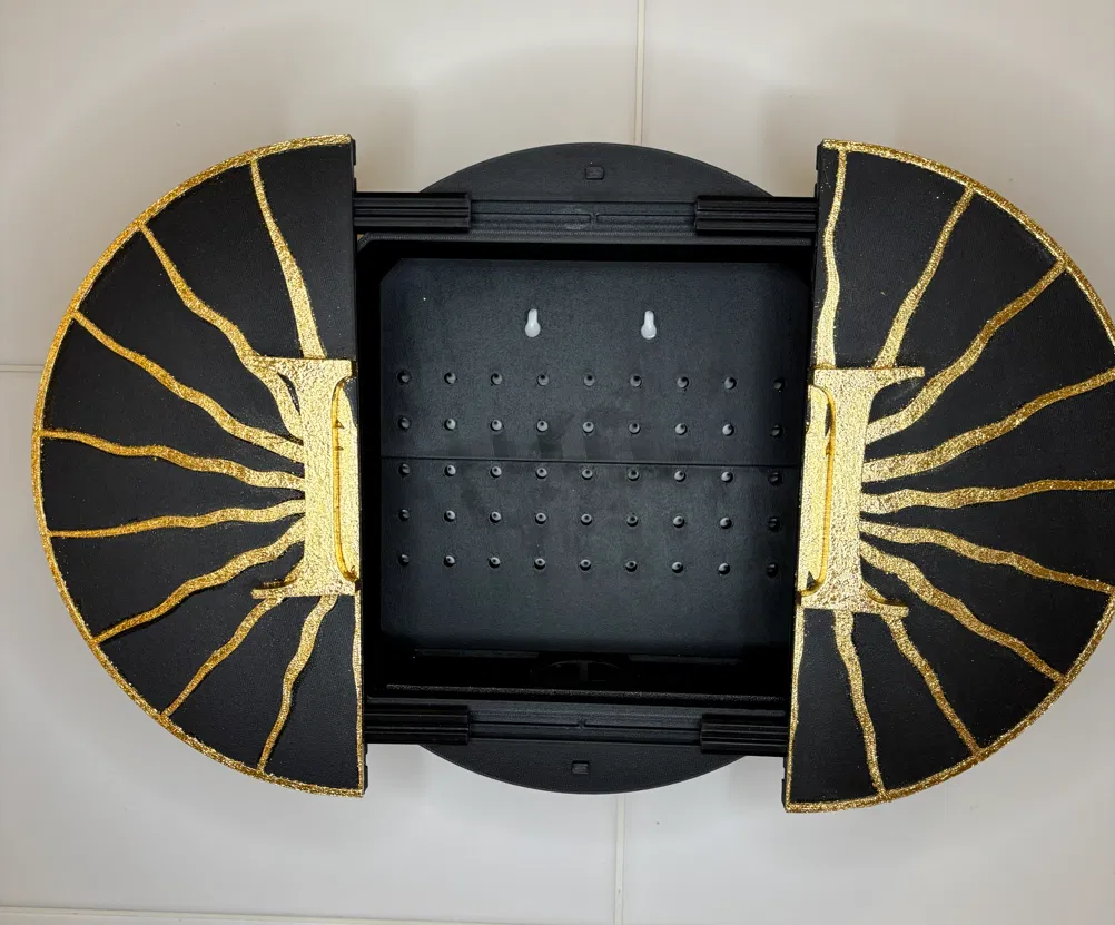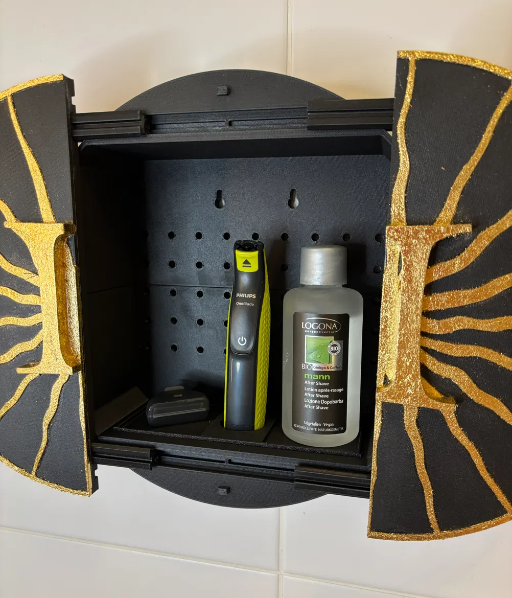 Đây là mẫu hộp lưu trữ OneBlade có thể tùy chỉnh của mình. Bên trong hộp có thể tùy biến hoàn toàn, với nhiều khay đựng phụ kiện và miếng lót đáy khác nhau. Bạn có thể thay đổi các phần này mà không cần in lại toàn bộ hộp. Phần đáy có thể thay đổi được và mặt sau là bảng pegboard để gắn thêm các khay tổ chức khác. Để lắp ráp hộp, bạn chỉ cần dùng keo dán và sơn hoặc lá vàng (mình dùng bộ dát vàng).