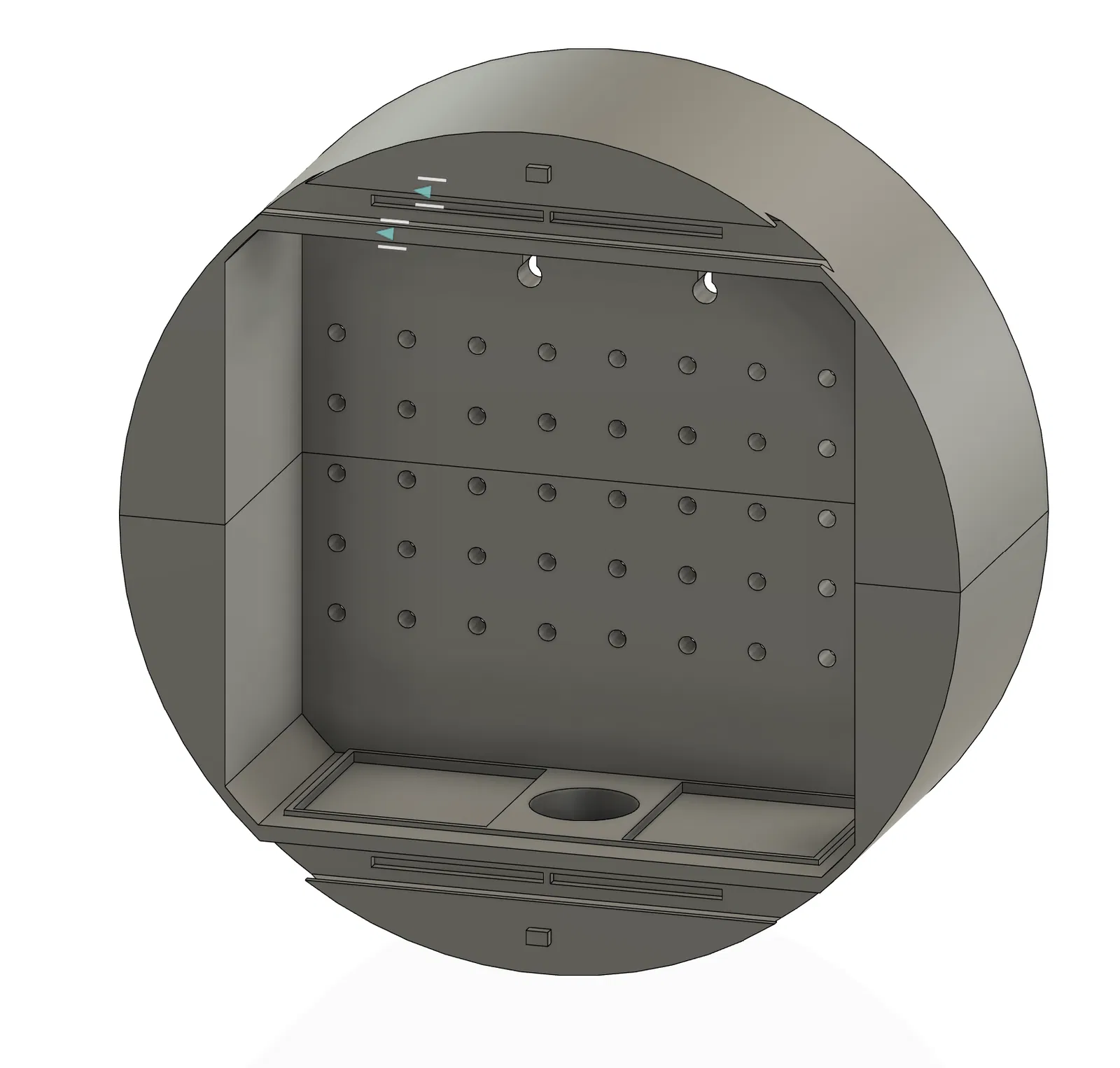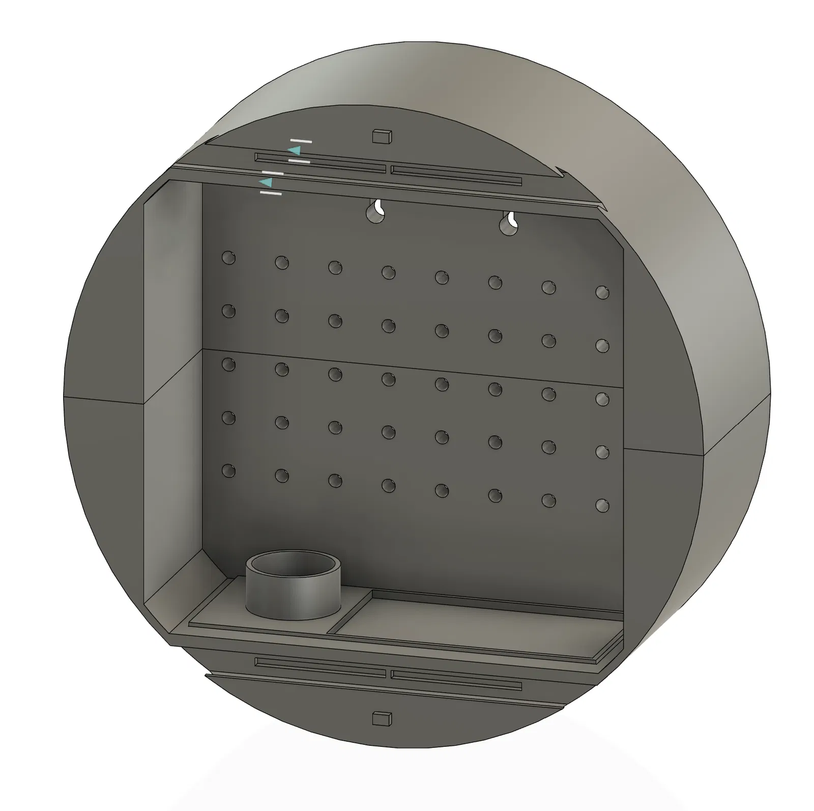 Mặt sau là bảng pegboard để giữ các khay đựng phụ kiện khác nhau. Các móc cho pegboard chỉ cần trượt vào cùng với khay (như khay đựng dây cáp), không cần dùng keo.