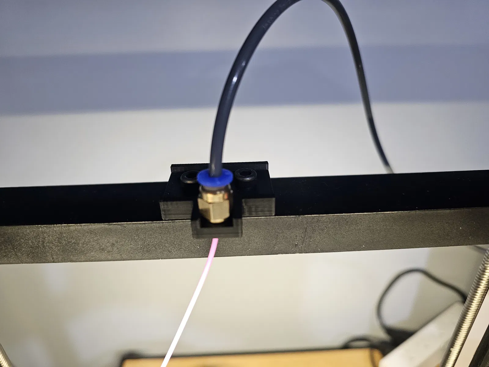 Mình vừa làm một cái ngàm để gắn đầu nối khí nén PC4-M6 lên phía trên máy Ender 3 V3 KE. Ngàm này tận dụng chính các lỗ M5 có sẵn của giá treo cuộn nhựa cũ. Bạn có thể dùng lại ốc vít của giá treo cũ để cố định, sau đó gắn ống dẫn nhựa PTFE từ phía trên xuống. Hiện tại mình đang dùng nó để nối với máy sấy nhựa Creality Space Pi đặt ở bên cạnh.