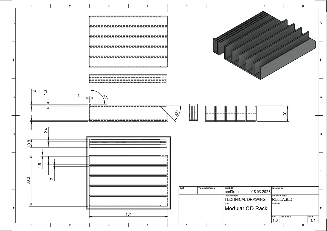 Hệ thống lưu trữ dạng module dành cho bộ sưu tập đĩa CD của bạn. Phần khung chính vừa vặn với các hộp đĩa jewel case tiêu chuẩn, đi kèm với một adapter được thiết kế riêng cho các loại bao bì giấy mỏng để tránh tình trạng đĩa bị đổ ngã. Mọi chi tiết đều được thiết kế để đảm bảo độ bền và dễ dàng sử dụng.