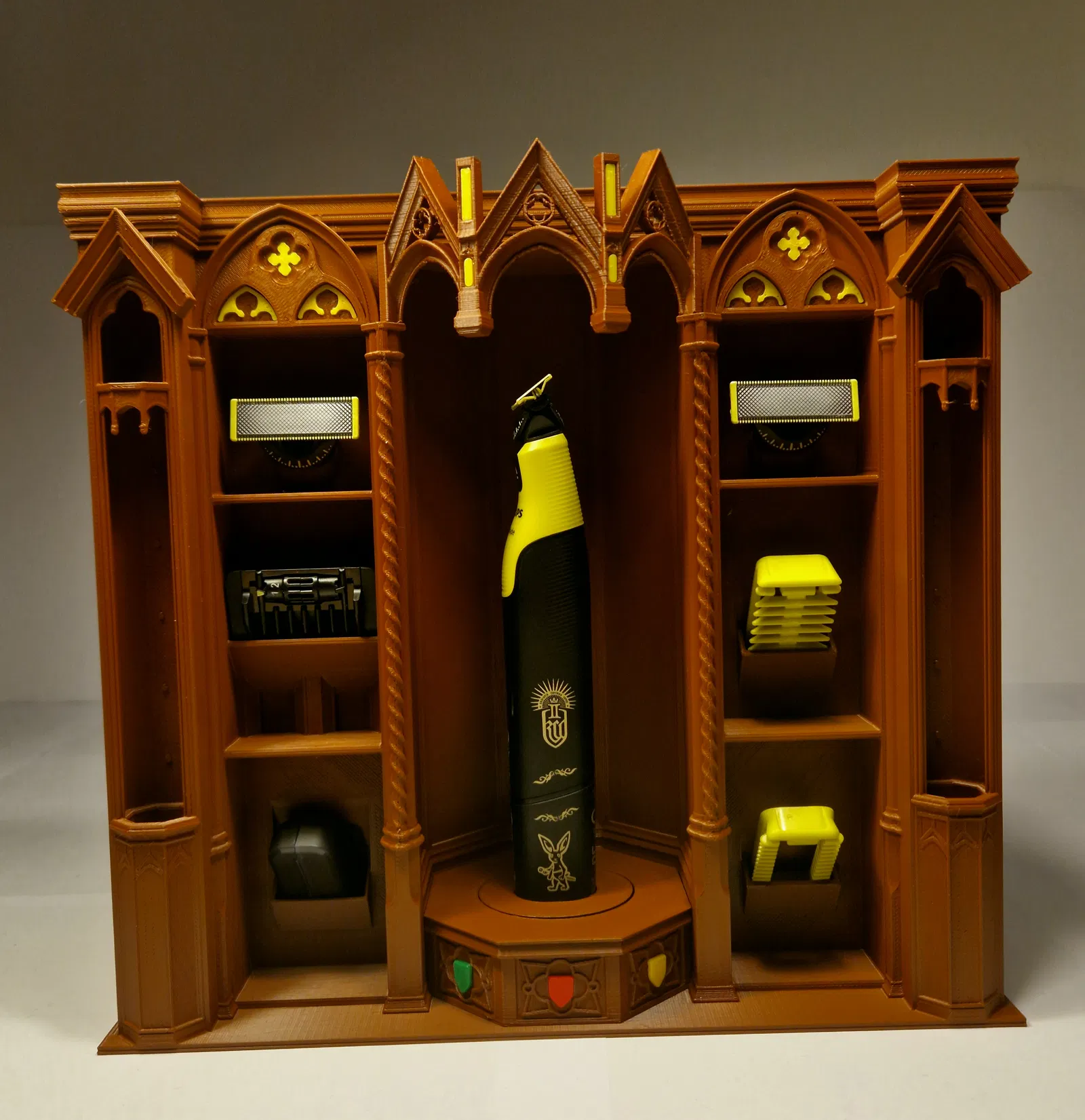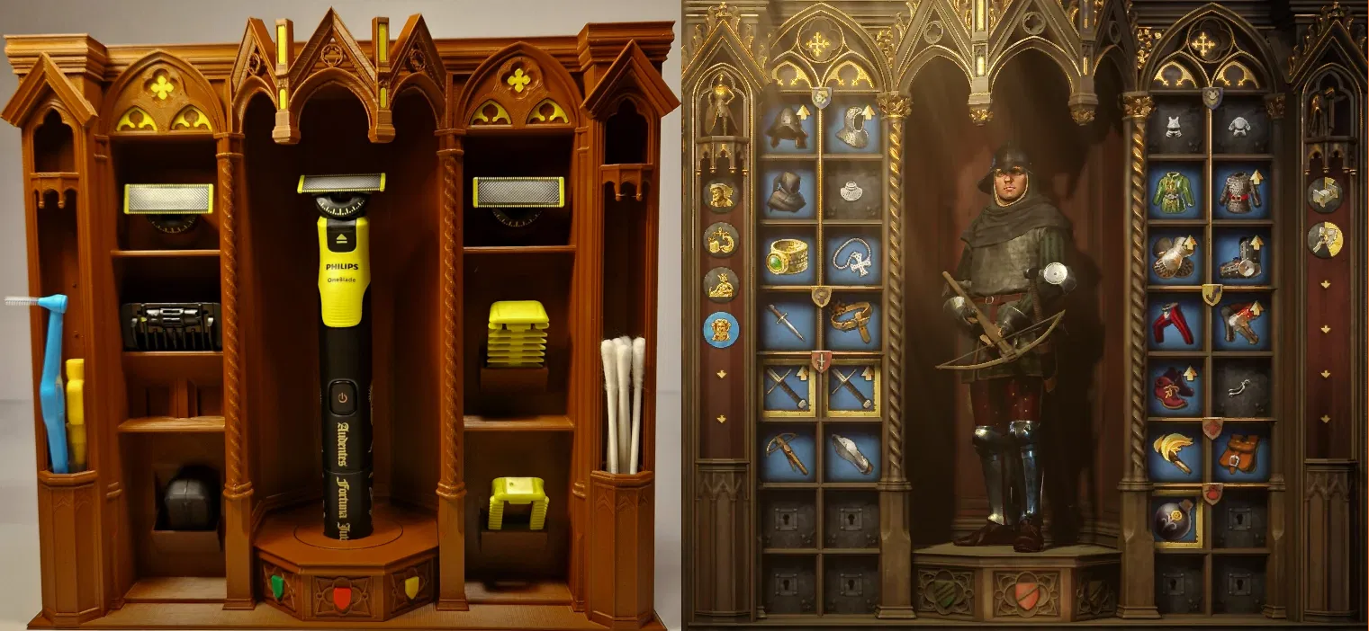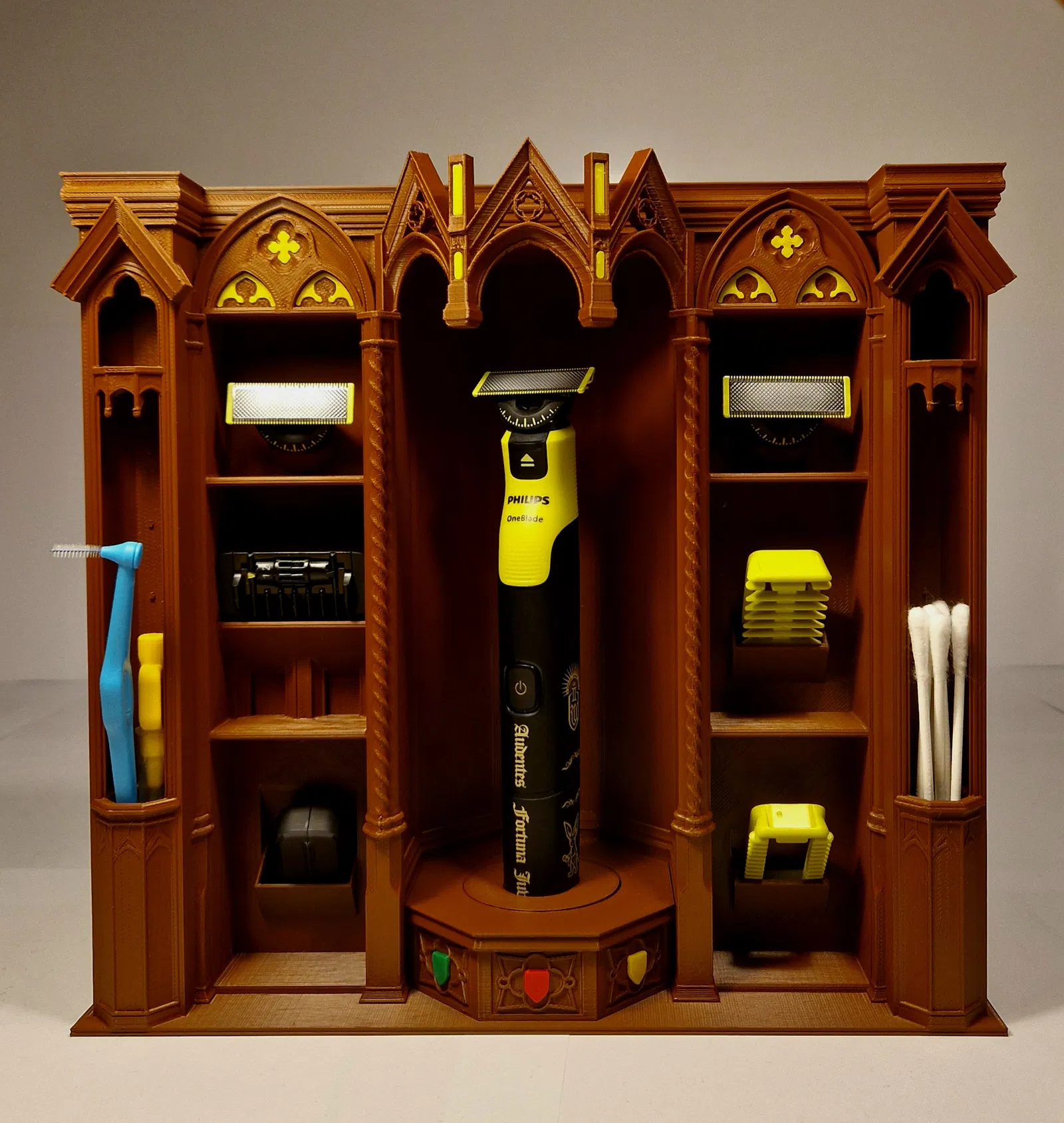 Mình cực kỳ phấn khích khi giới thiệu góc nhìn của mình về cuộc thi thiết kế Philips OneBlade & KCD2. Bộ giá đỡ này được lấy cảm hứng rõ rệt từ giao diện inventory trong trò chơi huyền thoại của Séc là Kingdom Come: Deliverance II. Thay vì Henry (Jindra), giờ đây bạn có thể đặt chiếc OneBlade (Jednočepelák) yêu quý của mình lên bệ vinh quang. Bạn đã có một chiếc hộp đựng thời trang cho OneBlade, giờ là lúc để có một "điện thờ" chăm sóc bản thân thật oai vệ. Mình đã cố gắng hết sức để tái tạo trung thực thiết kế inventory trong game, đồng thời vẫn đảm bảo tính thực dụng và khả năng in ấn tốt. Nếu bạn cần các file thiết kế .f3z (Fusion 360), hãy tải xuống file .zip bên dưới hoặc nhắn tin trực tiếp cho mình, mình rất sẵn lòng chia sẻ để các bạn remix.