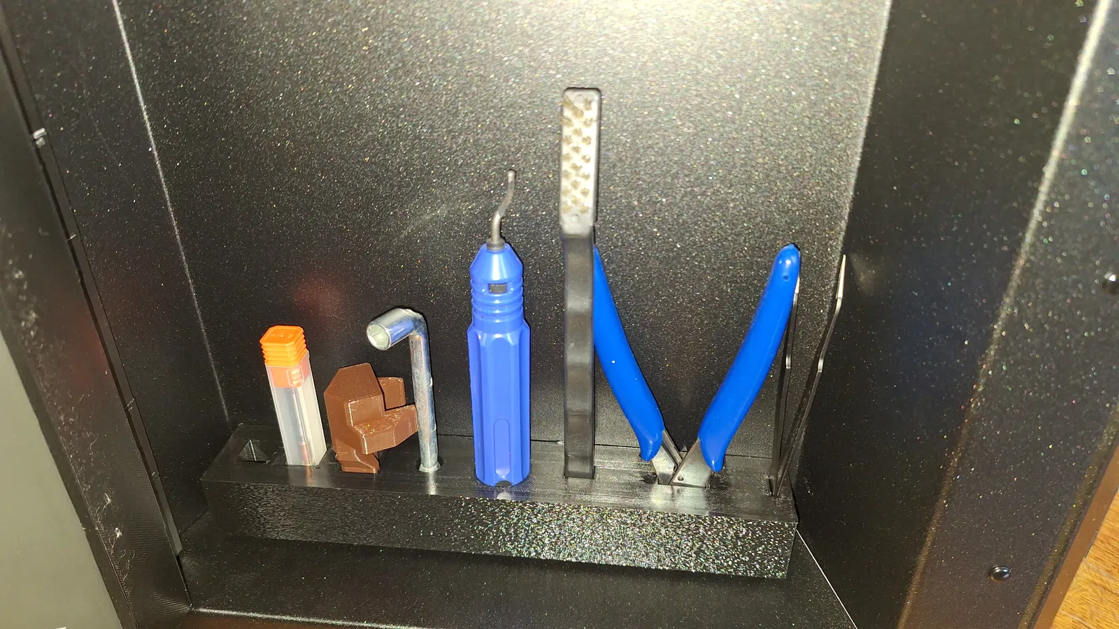 Một chiếc khay đựng dụng cụ tiện lợi giúp sắp xếp gọn gàng các món đồ cần thiết cho máy in 3D. Khay này được thiết kế để giữ cho nhíp, kìm cắt, cọ vệ sinh đầu in, dụng cụ gọt ba via, cờ lê đầu in, đế giữ khối gia nhiệt và hai đầu phun dự phòng luôn ngăn nắp và dễ lấy.