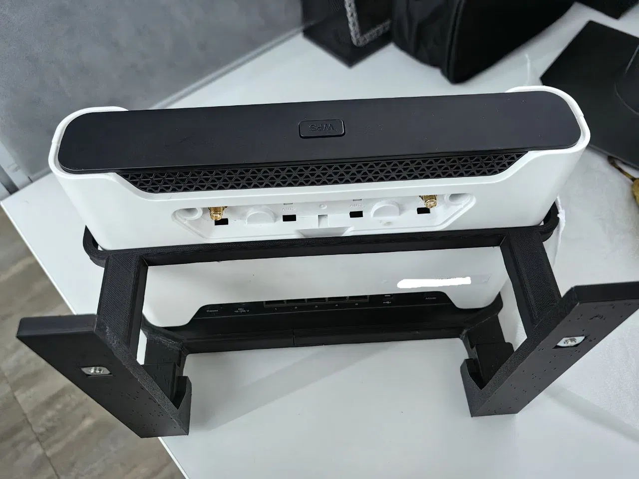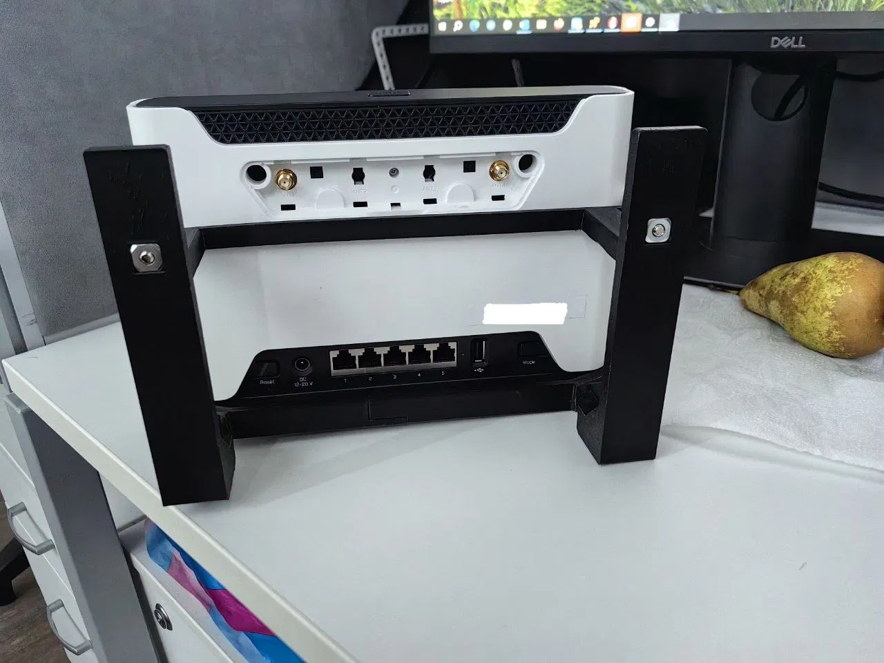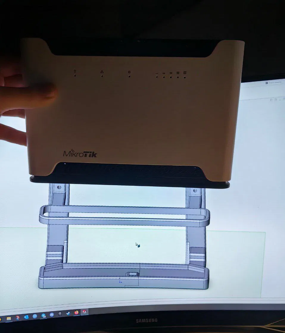 Khu vực lắp đai ốc dưới được gia cố nên có thể hơi cấn khi trượt Mikrotik vào rãnh. Mình đã khắc phục bằng cách mở rộng các thành bên, nhưng bạn cũng có thể cắt bớt các gân tăng cứng ở chân đế nếu cần. Bạn có thể dùng thêm băng keo điện hoặc ống co nhiệt ở các góc để cố định thiết bị hoàn hảo hơn.