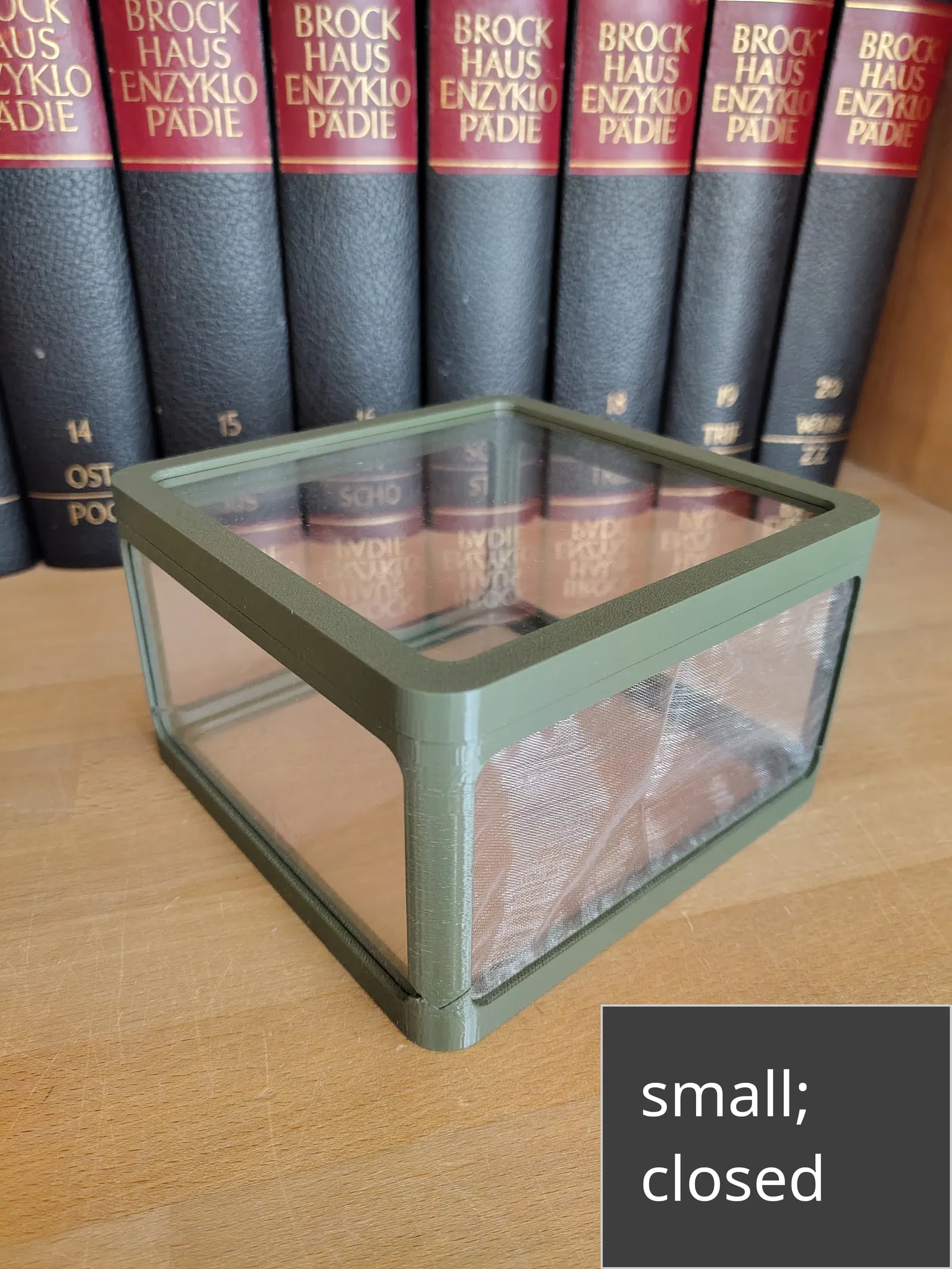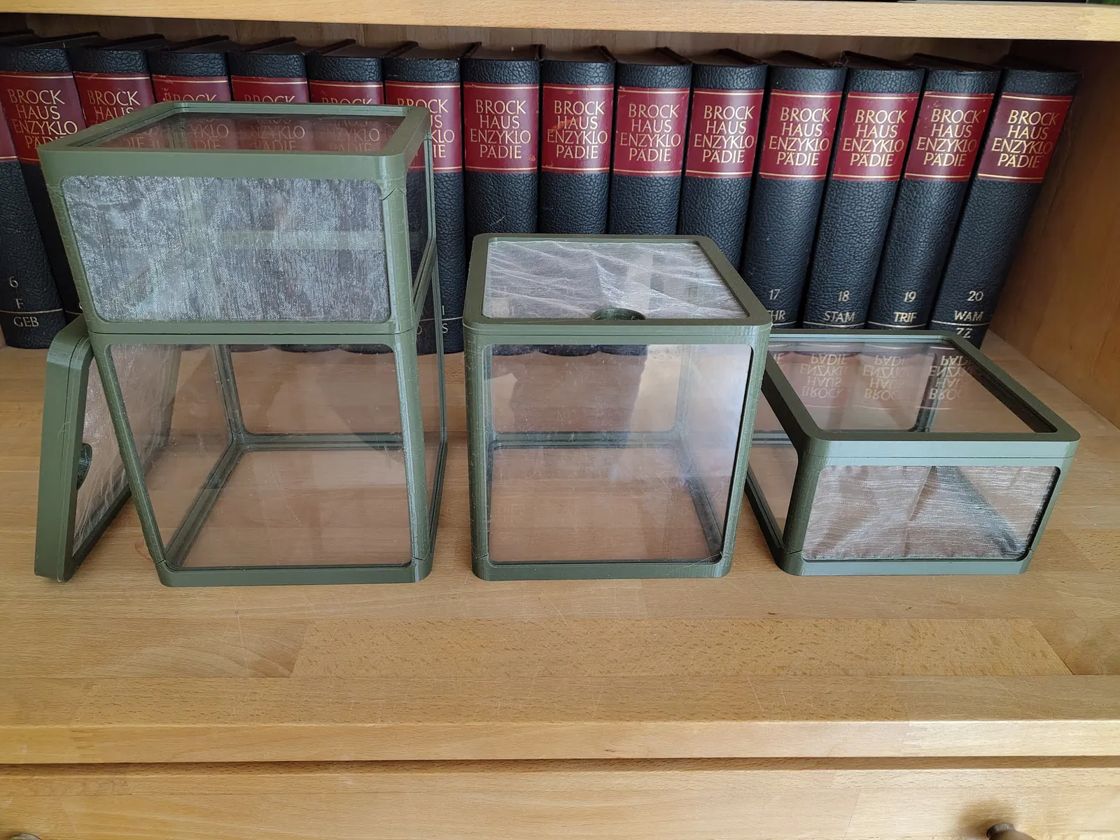 Terrarium này có ba kích cỡ: nhỏ, trung bình và lớn. Mẫu lớn được tạo thành từ thân của mẫu trung bình và nhỏ, trong đó phần nhỏ đóng vai trò là nắp đậy. Nếu bạn in đủ các nắp cần thiết, Terrarium có thể được tách thành hai cái riêng biệt bất cứ lúc nào.