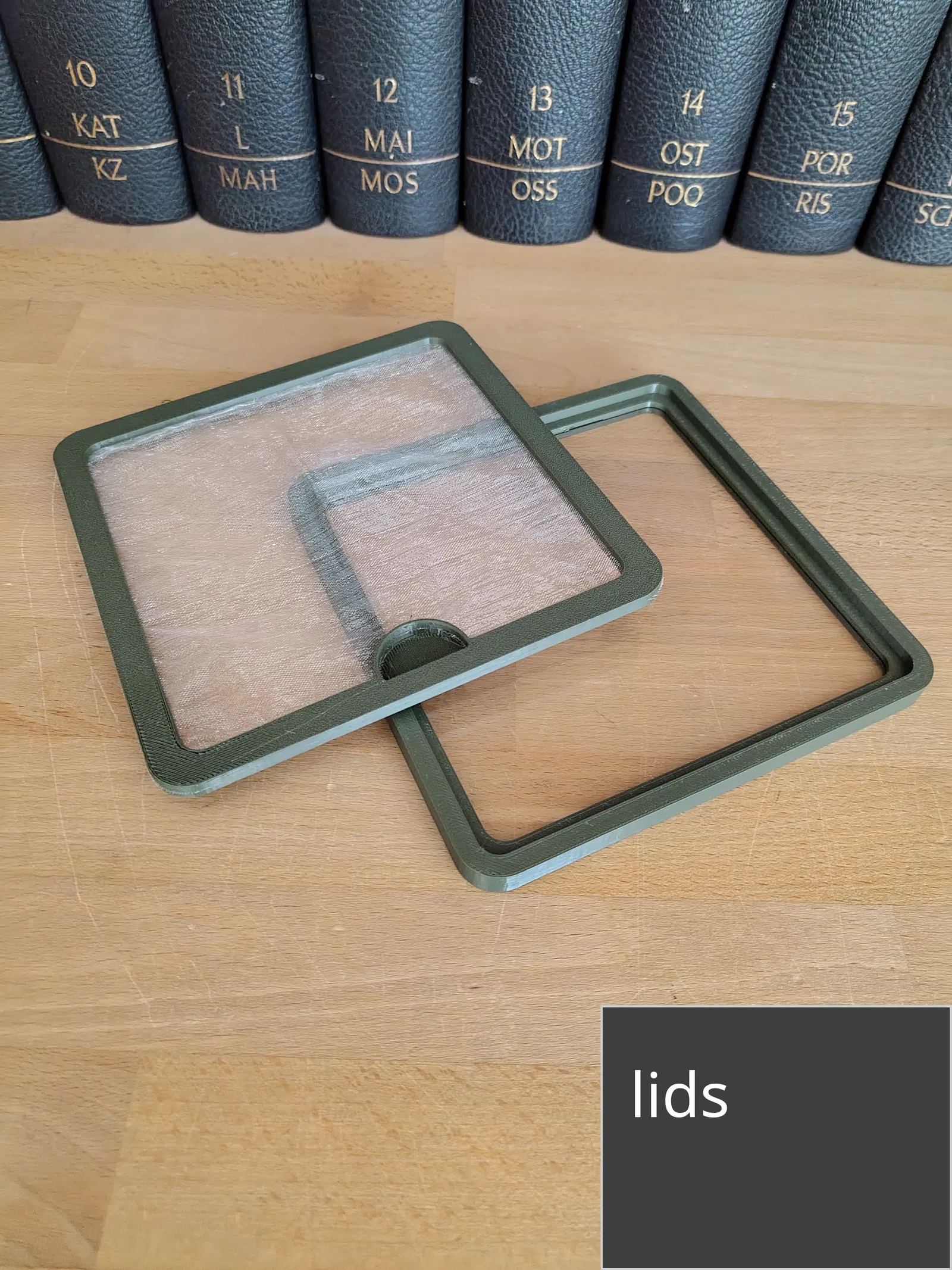 - 1x body medium, 1x body small, 2x end cap, 1x net frame small, 1x lid small solid, 1x lid medium breathable