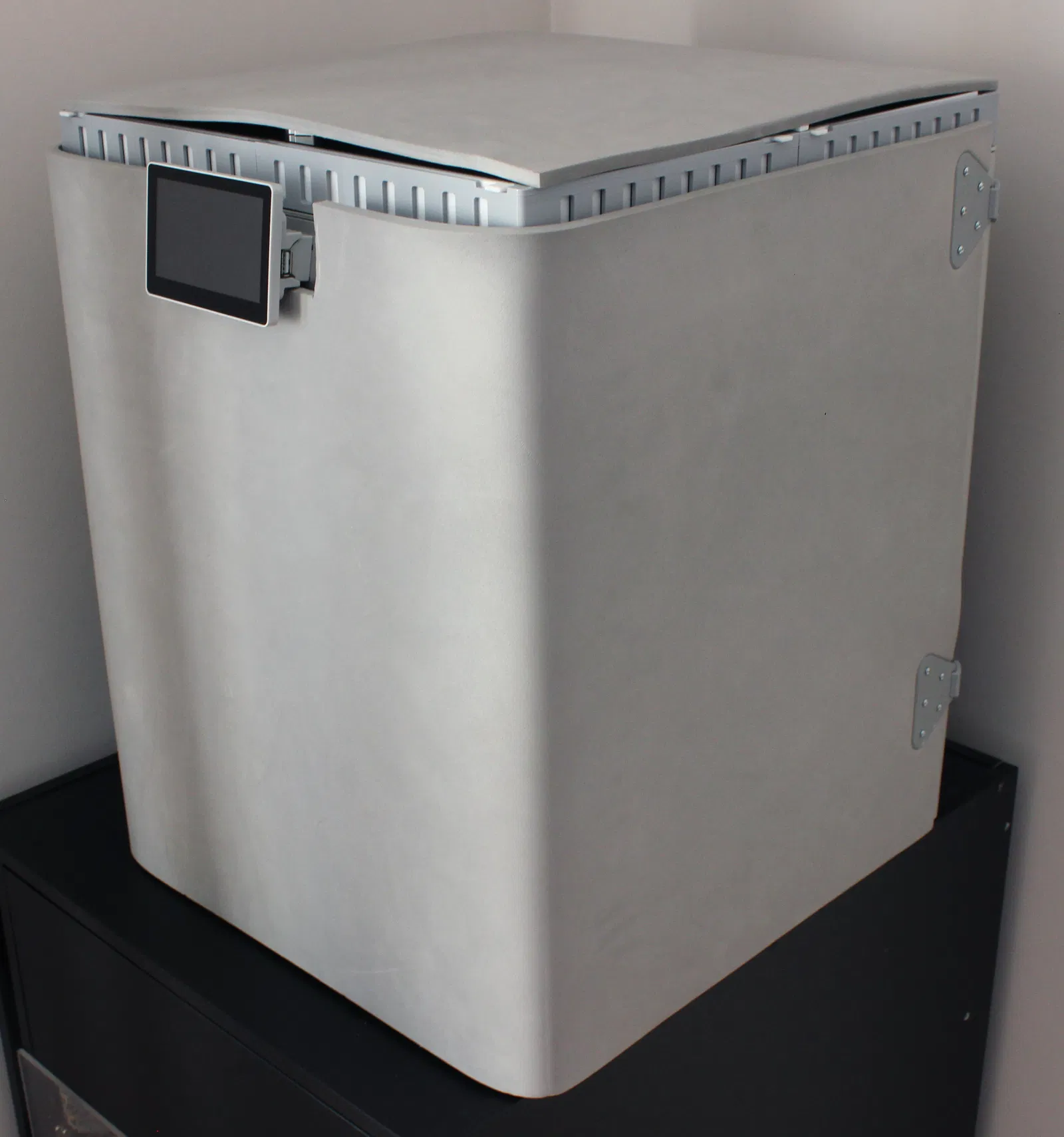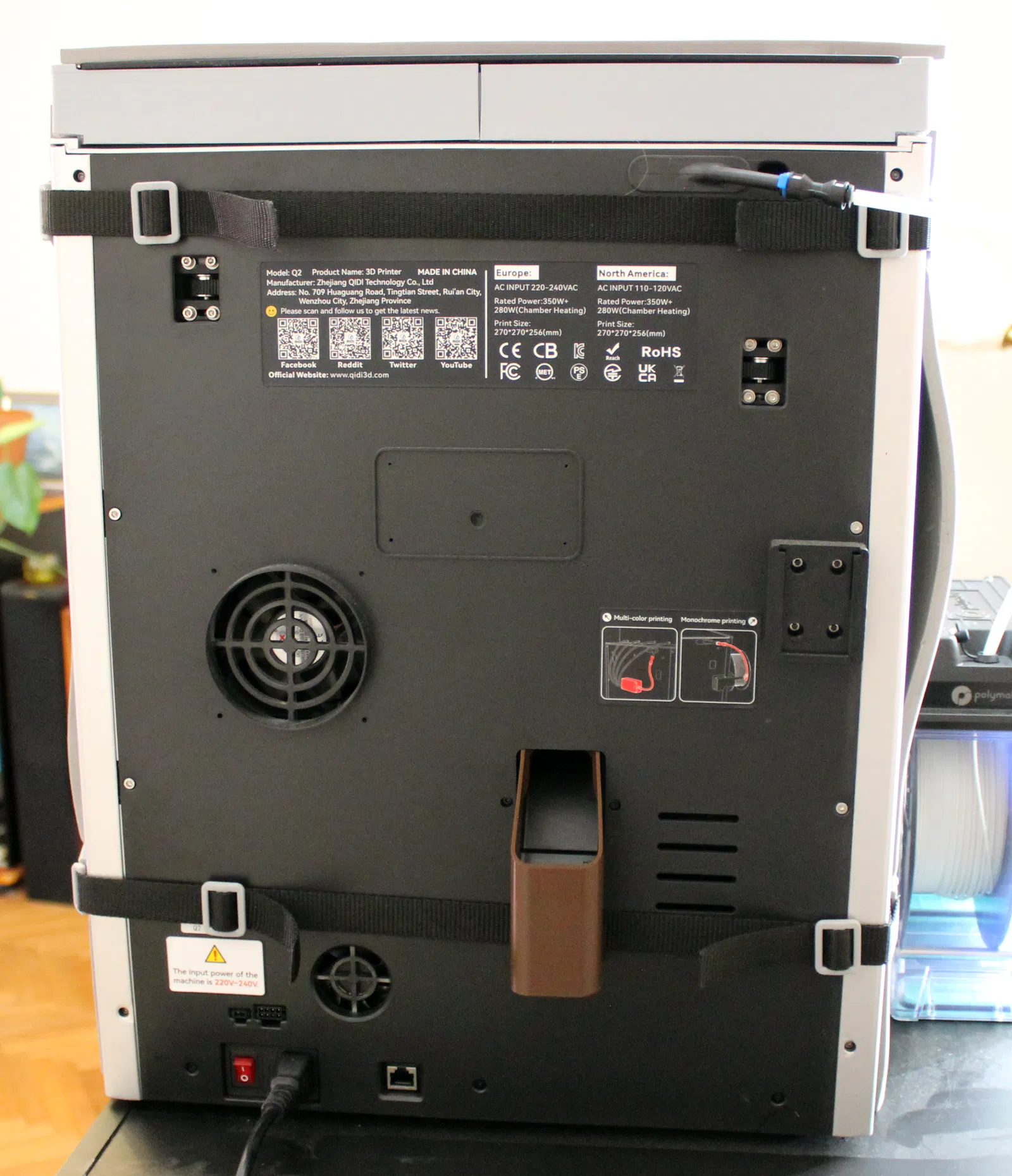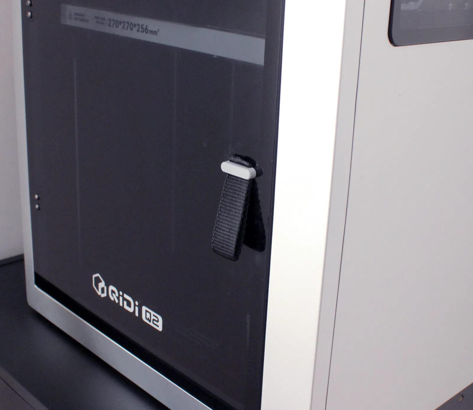 Mình thỉnh thoảng in nhựa PC và PA ở nhiệt độ buồng in 60 °C trên máy Qidi Q2. Bộ phận gia nhiệt buồng in phải hoạt động rất vất vả để duy trì nhiệt độ cao, điều này gây lãng phí năng lượng đáng kể trong những bản in dài. Do đó, mình quyết định lắp thêm lớp cách nhiệt xung quanh máy in. Sau khi bọc cách nhiệt và in PC với nhiệt độ bàn in 110 °C, bộ phận gia nhiệt buồng in chỉ cần bật tắt ngắt quãng ở công suất thấp là đã duy trì được mức 60 °C. Ngoài việc tiết kiệm điện, lớp cách nhiệt này còn giúp giảm chênh lệch nhiệt độ bên trong buồng in, dù mình chưa kiểm tra xem nó có tạo ra sự khác biệt đáng kể hay không. Lớp cách nhiệt này lắp vào và tháo ra rất nhanh nhờ dây đai móc cài. Tay nắm cửa trước có thể thay thế bằng phiên bản low-profile sử dụng mẫu "Handle knob", một đoạn dây đai dài 15 mm và ốc vít gốc.