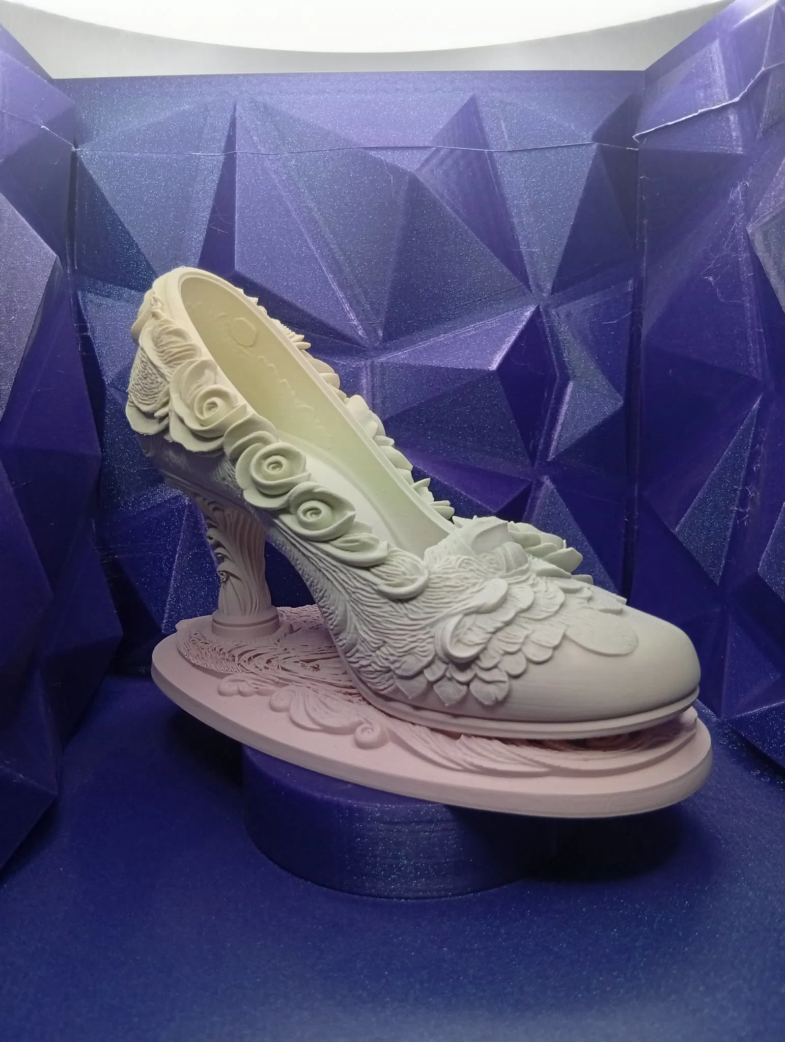 Một tác phẩm điêu khắc mang hơi hướng Regency đầy mê hoặc. Chiếc giày này không chỉ là vật phẩm trang trí, mà còn là biểu tượng cho khoảnh khắc đáng nhớ của mối tình đầu, với những đường nét hoa hồng chạm trổ tinh tế, đầy tính nghệ thuật.