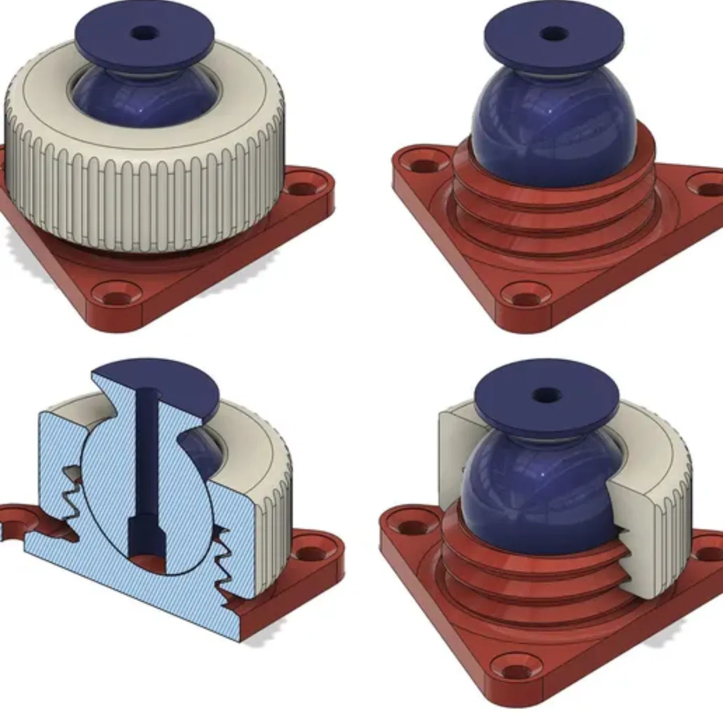 Điểm thú vị của mô hình này nằm ở cơ chế lắp ráp đơn giản nhưng vô cùng hiệu quả. Phần đế màu đỏ được thiết kế với các lỗ bắt vít sẵn, giúp bạn dễ dàng gắn cố định vào khung máy hoặc bề mặt phẳng. Phần nắp vặn màu sáng giúp cố định viên bi ở giữa, tạo ra một ma sát vừa đủ để giữ vị trí mà vẫn đảm bảo độ mượt mà khi xoay. Nhờ vào cấu trúc này, bạn có thể tự mình điều chỉnh độ chặt hoặc lỏng của khớp nối chỉ bằng cách xoay nhẹ phần nắp, cực kỳ tiện lợi cho nhiều mục đích sử dụng khác nhau.