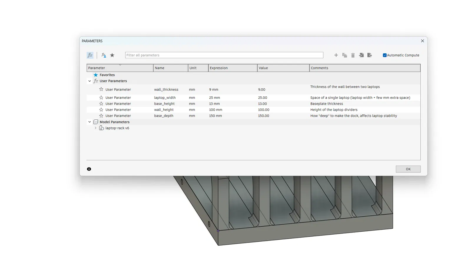 Giải pháp lưu trữ mô-đun giúp sắp xếp nhiều laptop ở vị trí thẳng đứng trên kệ. Rất phù hợp cho các phòng kho của bộ phận IT. Mỗi khối có các vách ngăn đủ chỗ cho bốn chiếc laptop. Bạn có thể đặt nhiều khối cạnh nhau để lấp đầy toàn bộ diện tích kệ. Khoảng cách giữa các vách ngăn là tham số (parametric) - bạn có thể điều chỉnh từ khe hẹp (cho Macbook Air) đến khe rộng (cho Thinkpad). Lắp ráp Các khối này có 2 lỗ ở phần đế để xỏ thanh kim loại (đồng hoặc thép) đường kính 3mm. Thanh này giúp kết nối các khối thành một thể thống nhất, cứng cáp, tránh việc các khối bị đổ hoặc trượt. Bạn chỉ cần luồn thanh vào, sau đó dùng keo dán cố định hai đầu. Đối với kệ kim loại hoặc bề mặt trơn, hãy dán thêm băng dính hai mặt hoặc băng dính chống trượt dưới đế để giữ cố định. In ấn Khuyến nghị: In với độ infill 20%, chất liệu PETG, sử dụng bàn in trơn (để tránh bị cong vênh), không cần support (nếu máy in của bạn xử lý tốt phần overhang ở đỉnh vòm), nên thêm lớp brim để hạn chế cong vênh trong quá trình in. Bạn có thể tùy chỉnh kích thước vách ngăn và laptop theo ý muốn (thông qua file f3d → User Parameters).