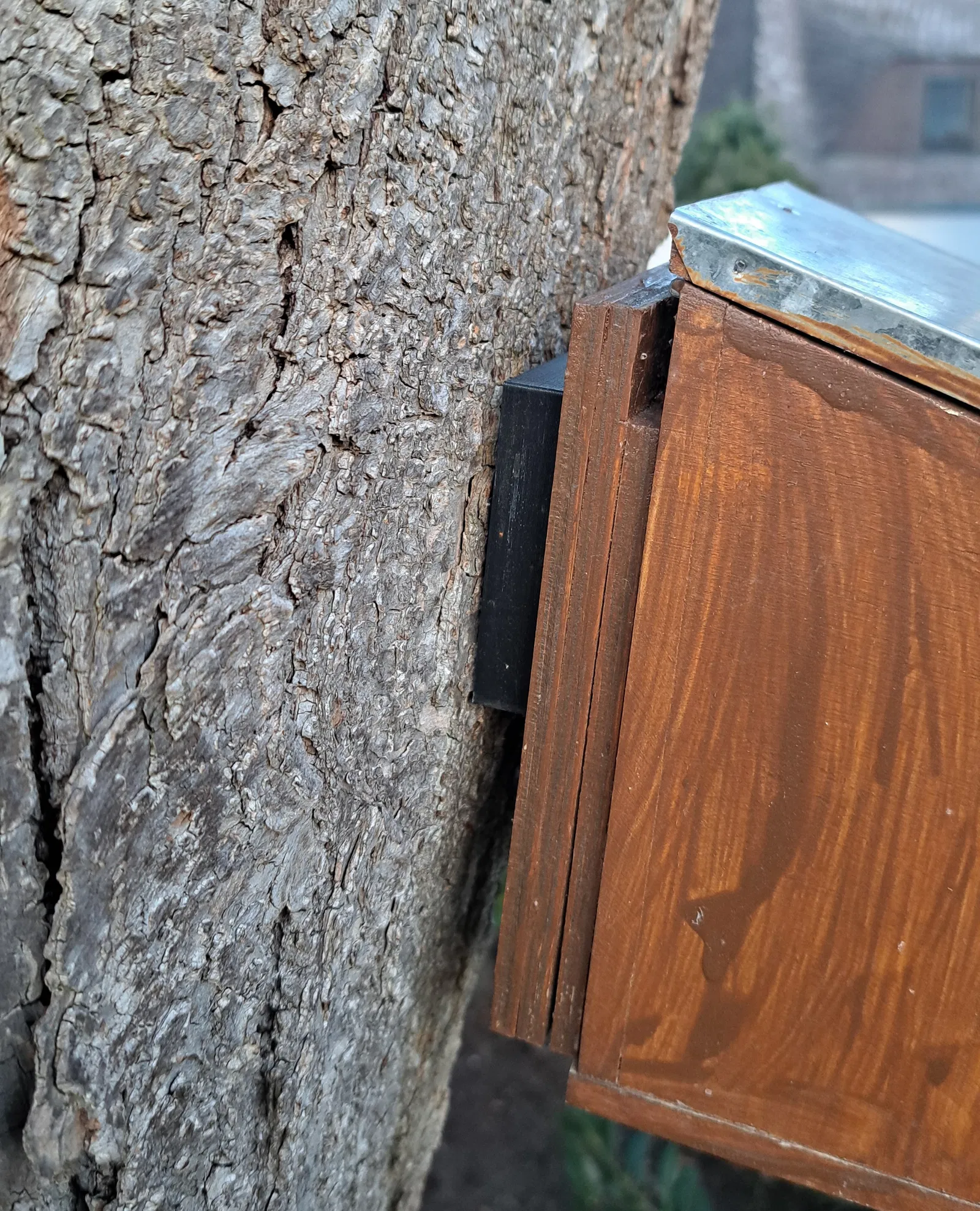Thiết kế này bao gồm hai phần tách biệt: một phần cố định chắc chắn vào thân cây bằng vít, và một phần còn lại được gắn vào phía sau của ngôi nhà gỗ. Cơ chế trượt cho phép bạn gắn nhà sóc vào vị trí chỉ trong vài giây và cũng có thể nhấc ra nhanh chóng bất cứ khi nào cần thiết mà không phải tháo rời toàn bộ ốc vít trên thân cây. Đây là giải pháp cực kỳ thông minh để giữ cho môi trường sống của sóc luôn sạch sẽ mà không làm tổn hại quá nhiều đến cây cối trong vườn.