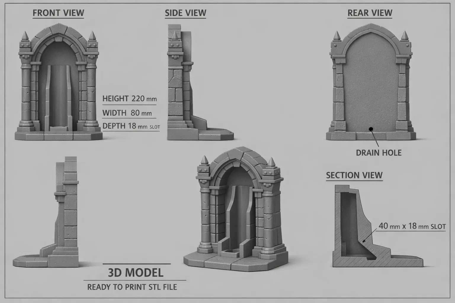 Chiếc máy cạo râu sẽ được đặt an toàn bên trong một hốc đá được bao quanh bởi các cột trụ và vòm cong kiểu Gothic. Cấu trúc này không chỉ làm cho chiếc giá trông rất đẹp mắt mà còn giữ cho máy cạo râu luôn chắc chắn và dễ dàng lấy ra sử dụng.