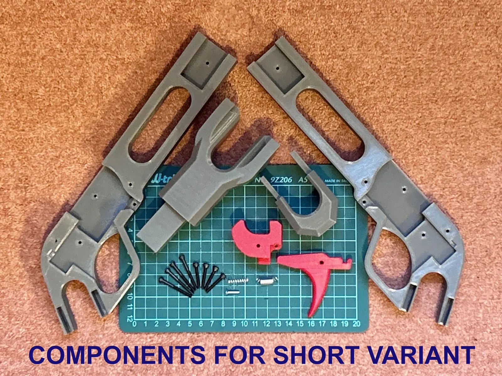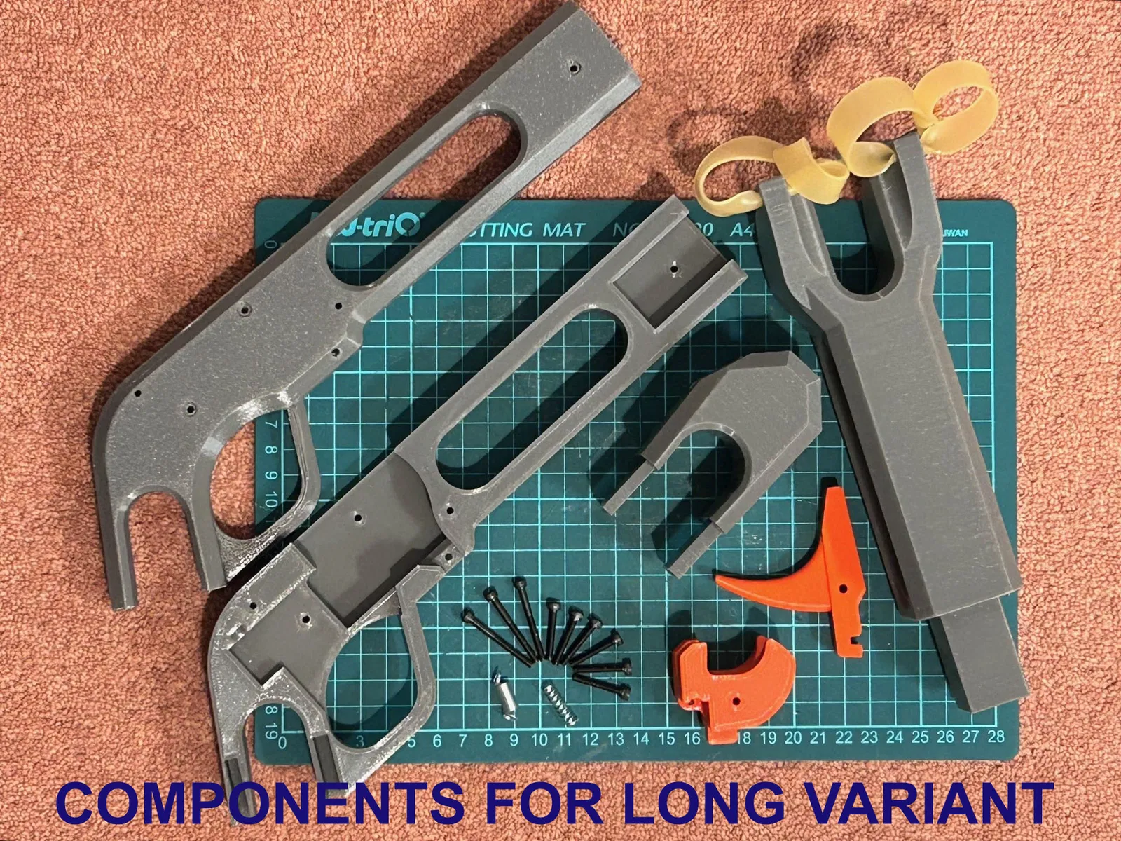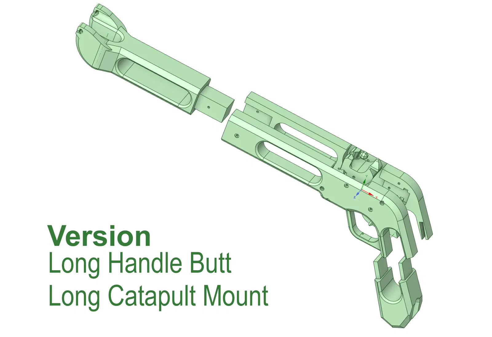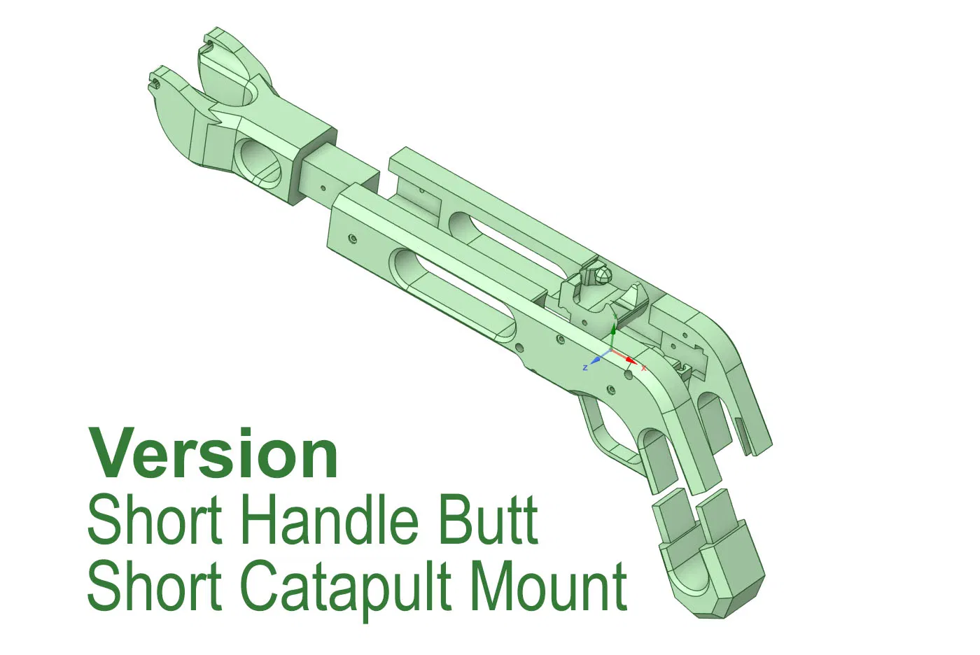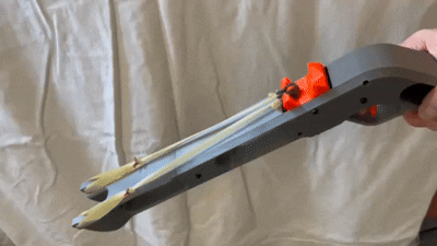 Có hai phiên bản: bản 'ngắn' giúp tối ưu kích thước để gắn dây thun và giá đỡ; bản 'dài' có phần giá đỡ cao nhất có thể trong giới hạn của Prusa MK4. Những ai có bàn tay lớn có thể dùng thêm phần báng súng phiên bản 'dài'. Cả hai mẫu đều thiết kế để dùng bằng hai tay. Các chốt định vị vừa đóng vai trò làm đòn bẩy lên cò, vừa là tấm chắn bảo vệ mắt nếu dây thun bị đứt.