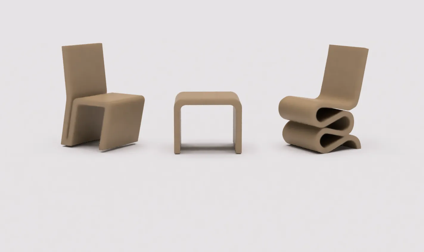 Ghế bên, Ghế đẩu và Ghế Wiggle phong cách Frank Gehry. Những chiếc gốc được làm từ bìa cứng xếp chồng.