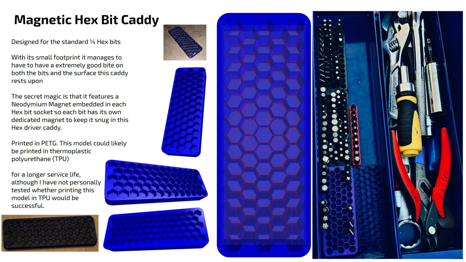 Đây chắc hẳn là một trong những thiết kế hữu dụng nhất của mình từ trước đến nay! Khay đựng đầu vít này giúp bạn sắp xếp gọn gàng các đầu lục giác và giữ chúng chắc chắn bằng nam châm, cực kỳ tiện lợi cho góc làm việc của bạn.