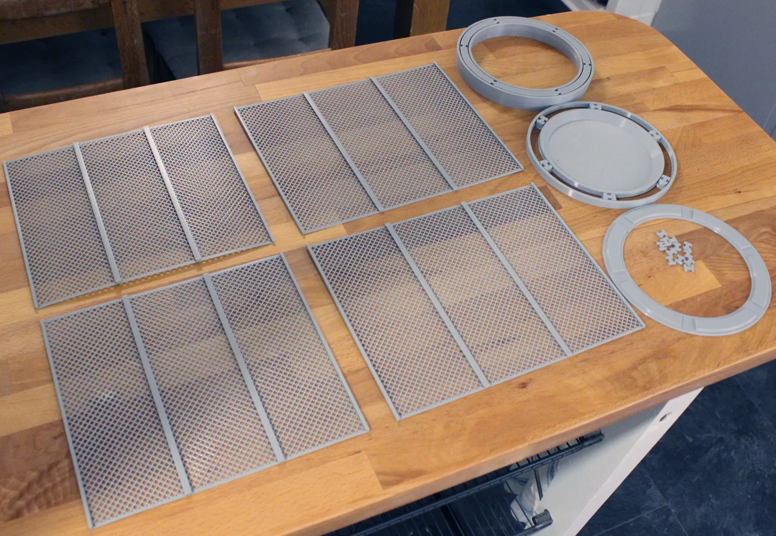 Thiết kế của mình lấy cảm hứng từ mẫu trước đó, nhưng phần lưới được in riêng lẻ và đặt nằm phẳng trên bàn in. Các mảnh lưới có tích hợp gân để tăng độ cứng và sẽ được uốn cong thành hình ống khi lắp ráp. Các chi tiết được kết nối bằng khớp cài mà không cần keo. Việc in lồng lọc thành nhiều phần tuy tốn công hơn một chút nhưng bù lại bạn sẽ có một khung lọc chắc chắn bằng PETG.