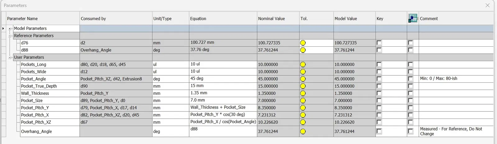 Các tham số có thể điều khiển: # của Túi Rộng # của Túi Dài Góc Túi (Hữu ích để lưu trữ các bit dài trong ngăn kéo nông) Độ Sâu Túi (Hữu ích cho các bit có thân dài hơn) Độ Dày Tường (Hữu ích để tăng khoảng cách) Kích Thước Túi (Kích thước phù hợp là 7mm, điều chỉnh để phù hợp chặt hơn hoặc lỏng hơn)