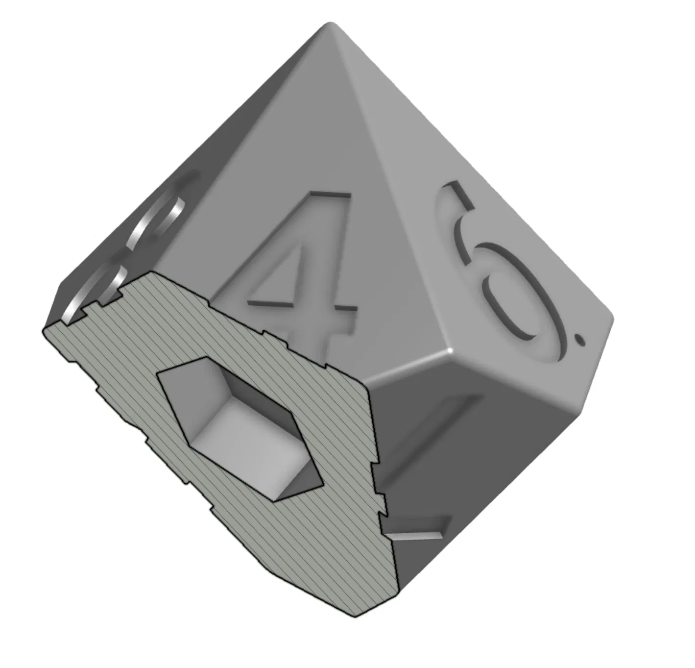 Mô hình này có tích hợp các khe lục giác để nhét ốc M6. Khi in hãy để mặt số 9 hướng xuống dưới. Tạm dừng in ngay trước khi các hốc kín lại, nhét ốc vào (có thể dán keo để tránh bị kêu lạch cạch), sau đó tiếp tục in. Phần trọng lượng thêm vào này sẽ giúp xúc xắc dễ đổ ra mặt đầu lâu hơn.