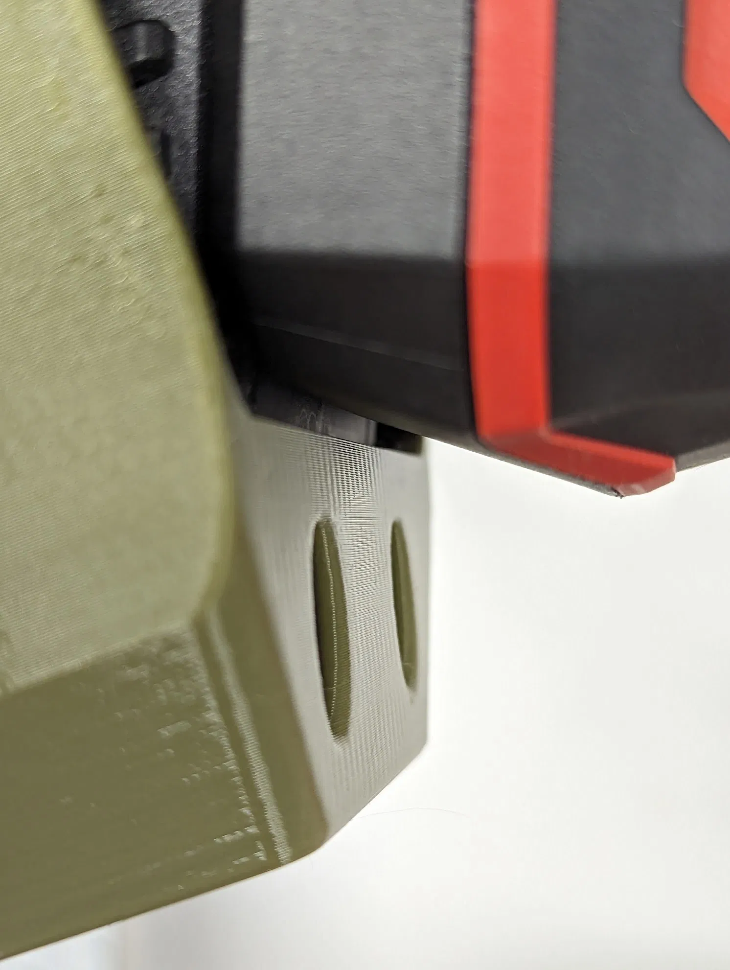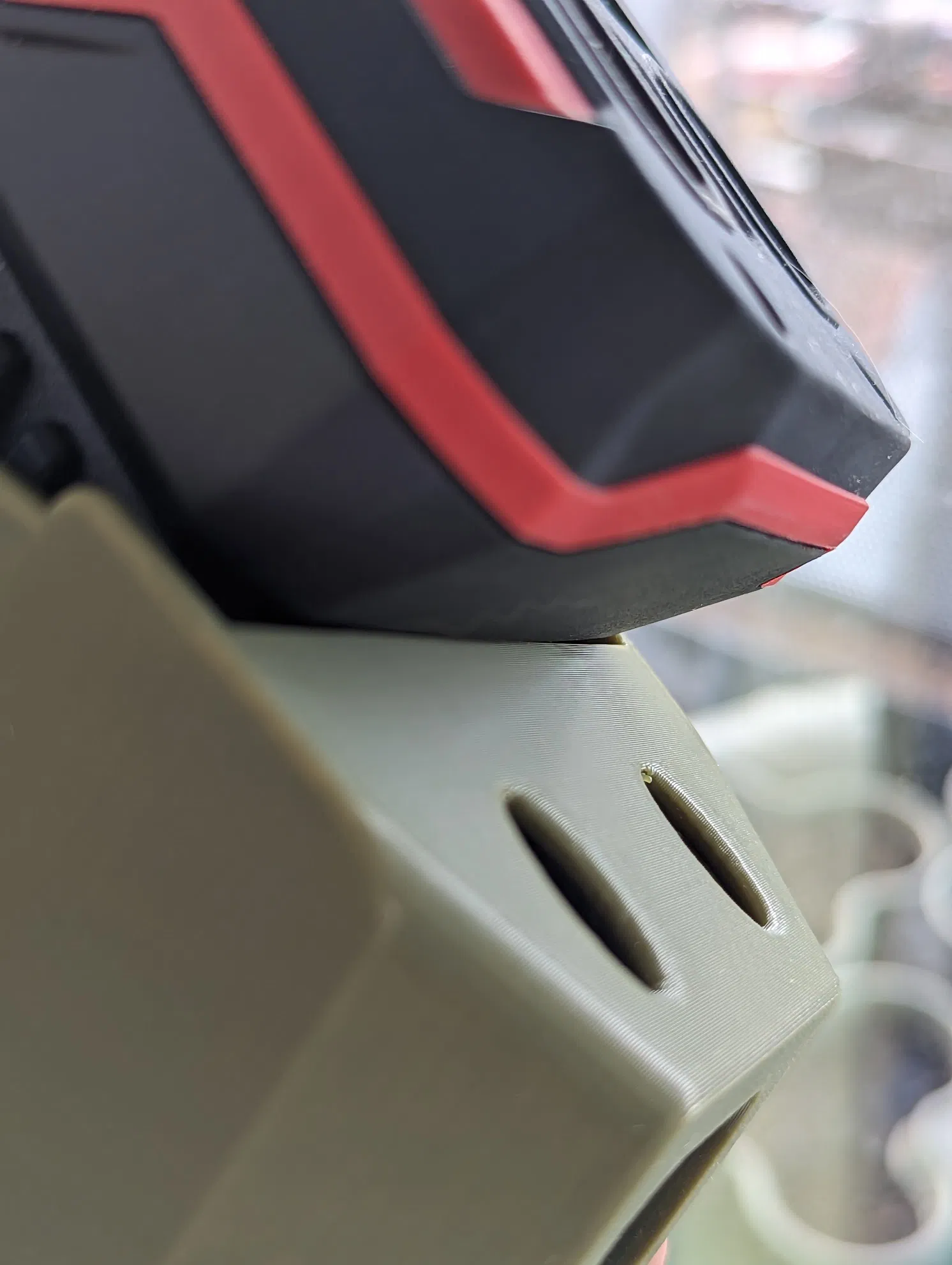 Mình đã in thử mẫu gốc nhưng nhận ra pin không "khớp" vào sạc mà chỉ chạm nhẹ vào các điểm tiếp xúc. Mọi người xem ảnh để rõ hơn nhé. Vì vậy, mình đã chỉnh sửa lại thiết kế để pin có thêm 6mm không gian, giúp trượt vào bộ sạc dễ dàng hơn. Mình cũng thay đổi các lỗ bắt vít và làm phần vát (chamfer) rộng hơn, giờ đã vừa khít với vít gỗ 3.5mm. Ngoài ra, mình thấy hai cái "mấu" ở phía trước không cần thiết nên đã bỏ luôn rồi.