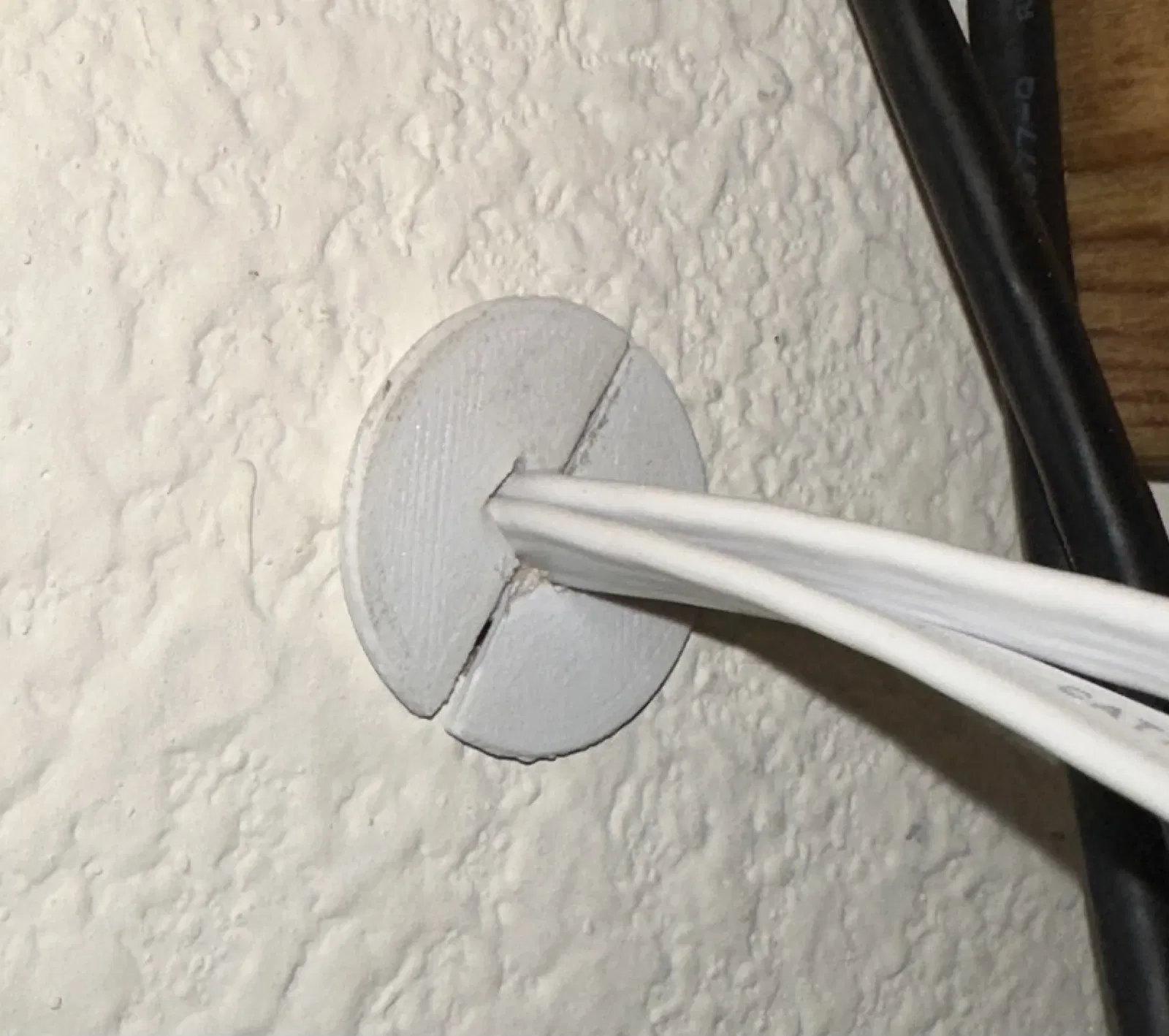 Anh em in hai bản của chi tiết này nhé. Đặt một hoặc hai sợi cáp Ethernet dẹt vào trong nắp che (gland) trước khi ghép hai nửa lại với nhau. Lý do mình tách làm hai nửa thay vì một khối là để anh em có thể luồn được những sợi cáp đã gắn sẵn đầu nối qua. Anh em khoan một lỗ trên tường thạch cao nhỏ hơn chốt trung tâm một chút, sau đó đẩy bộ nắp che đã lắp cáp vào lỗ. Nó sẽ tự giữ chặt ở đó nhé.