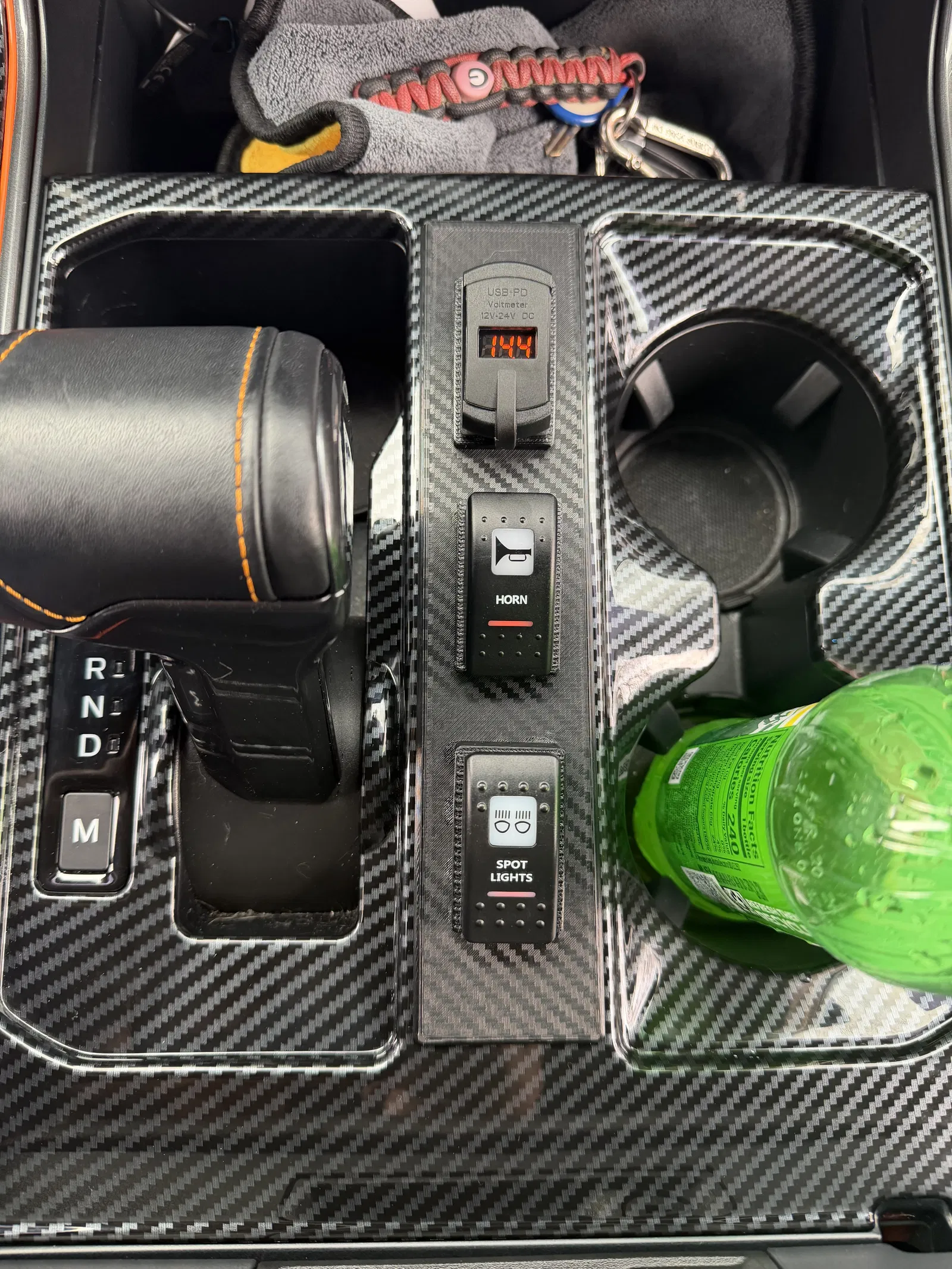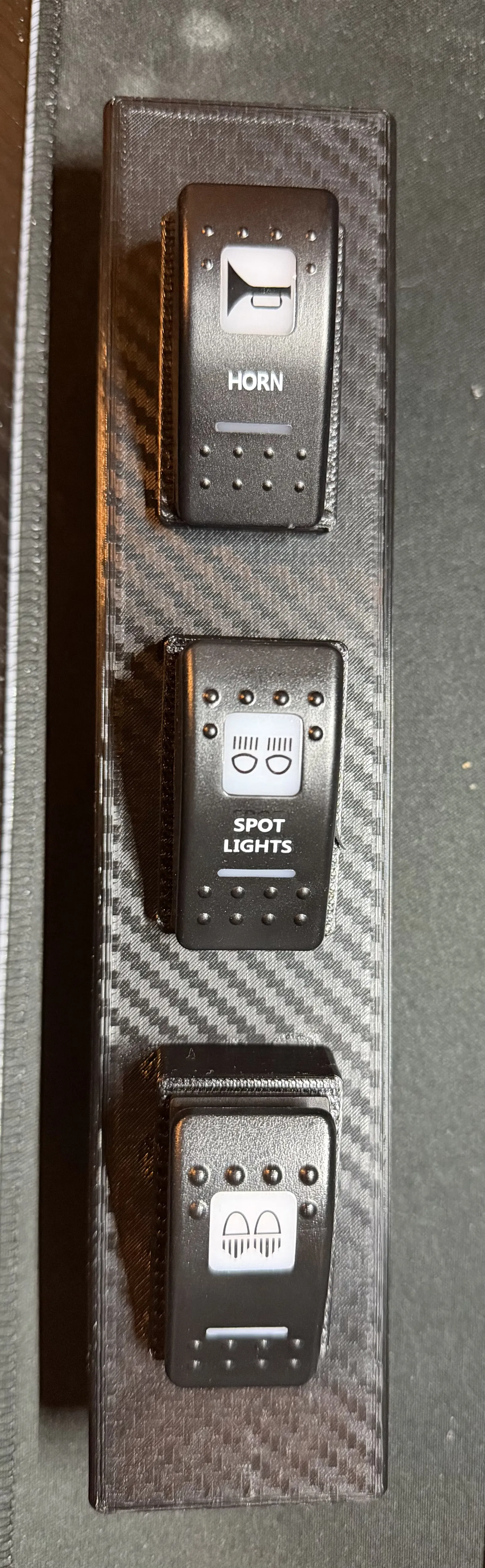 Đây là bảng điều khiển công tắc (switch panel) được thiết kế vừa vặn với khu vực để đồ hẹp nằm giữa khay đựng ly và cần số cho dòng xe Ford F150 đời 2021-2024. Phần đế được làm rộng hơn để che phủ toàn bộ khu vực trung tâm, giúp sản phẩm trông giống như hàng zin theo xe vậy. Mình đã in phần đế tách biệt với phần khung viền công tắc để tạo hiệu ứng vân carbon đẹp mắt. Cách làm này cũng giúp bạn không cần phải dựng support khi in 3D, rất tiện lợi.