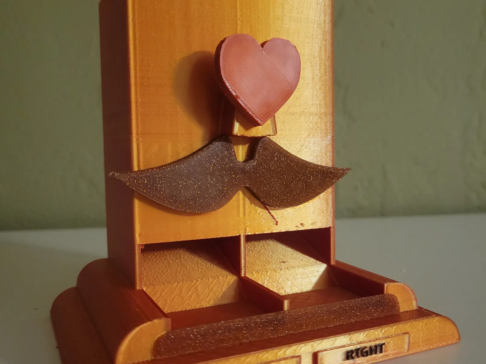 In phần thân chính và trái tim bằng PLA Dual Silk Orange và Glitter cho bộ ria mép và phần ở dưới cùng. In phần thân mất khoảng 7+ giờ, cộng thêm khoảng một giờ cho các phụ kiện trong bản remix. Mọi thứ đã được dán lại với nhau.