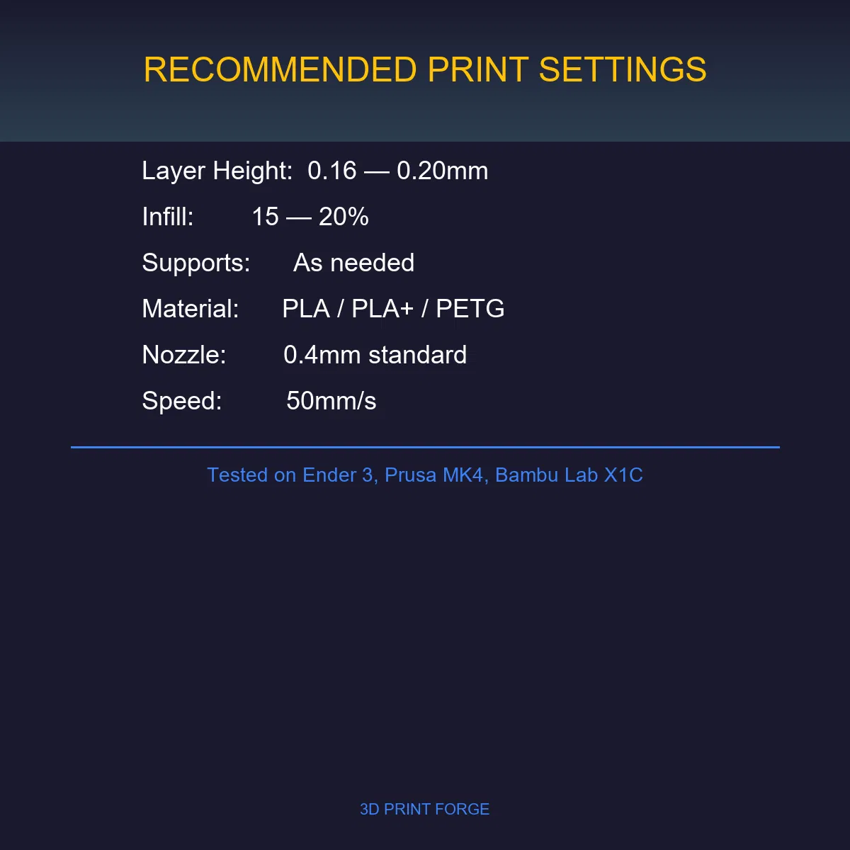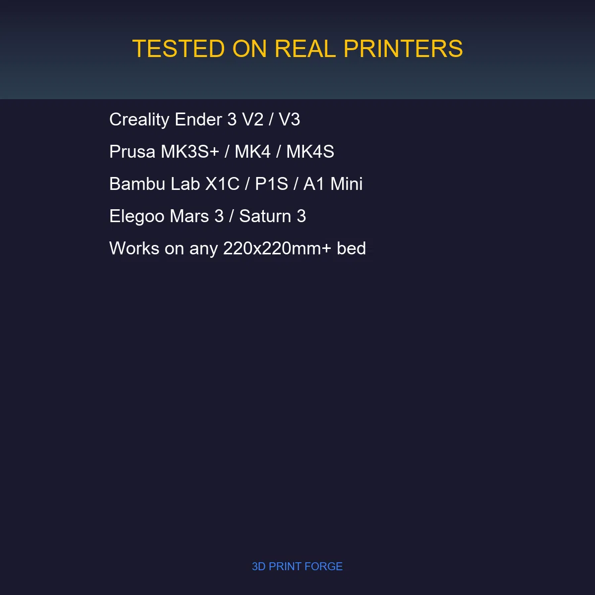 Đã kiểm nghiệm trên các máy: Ender 3 V2, Prusa MK3S+, Prusa MK4, Bambu Lab X1C, Bambu Lab P1S, Elegoo Mars 3