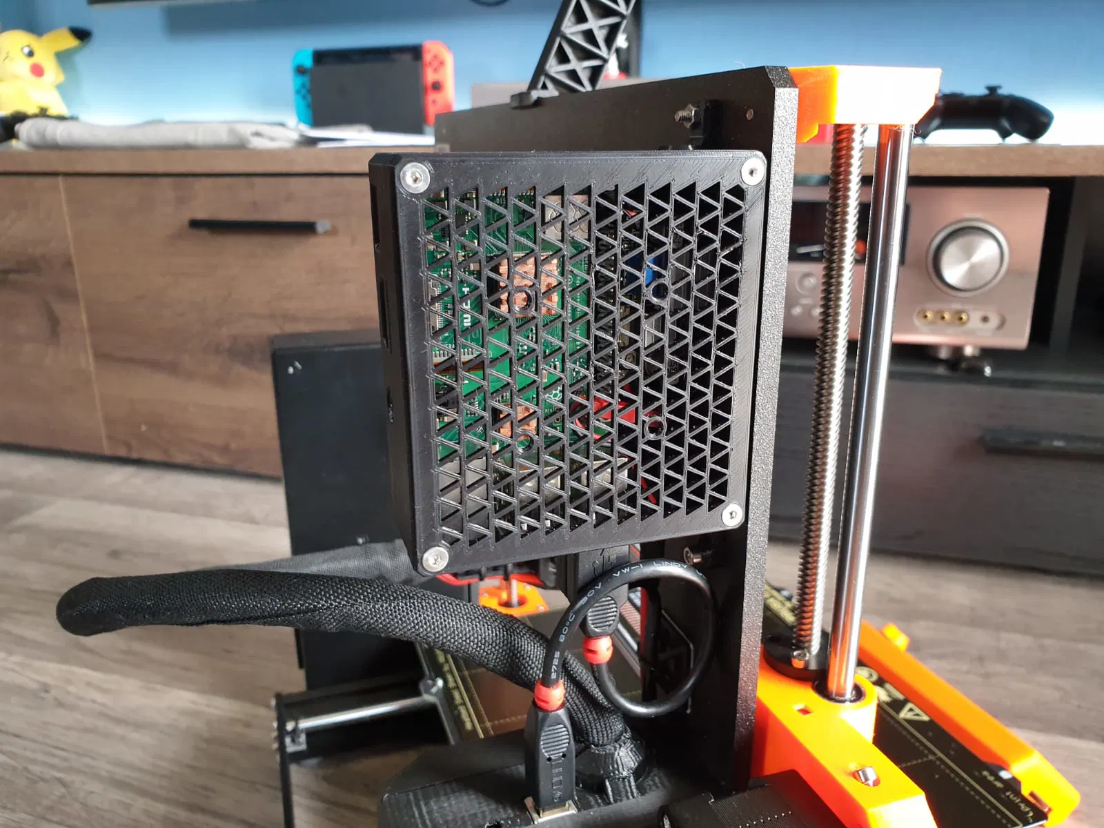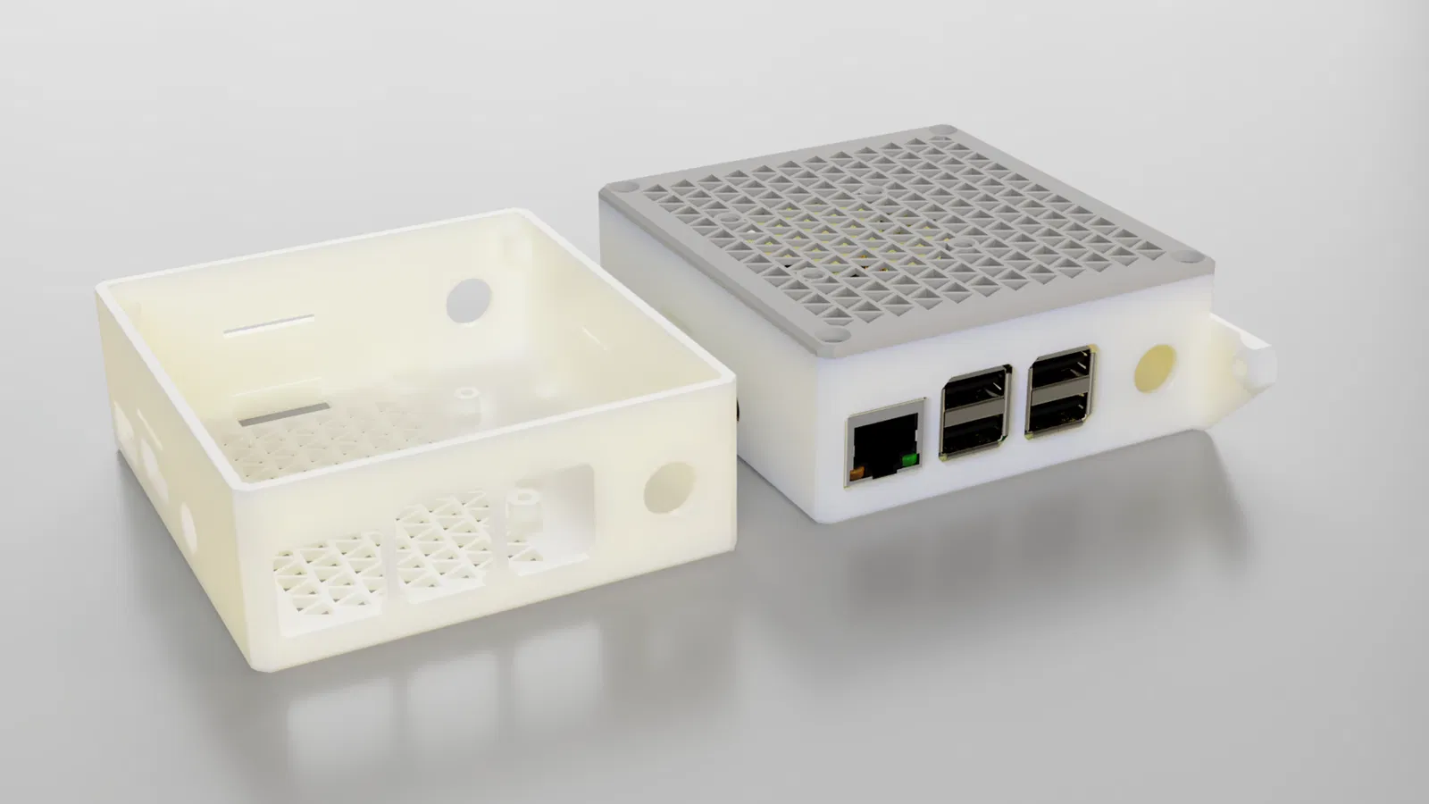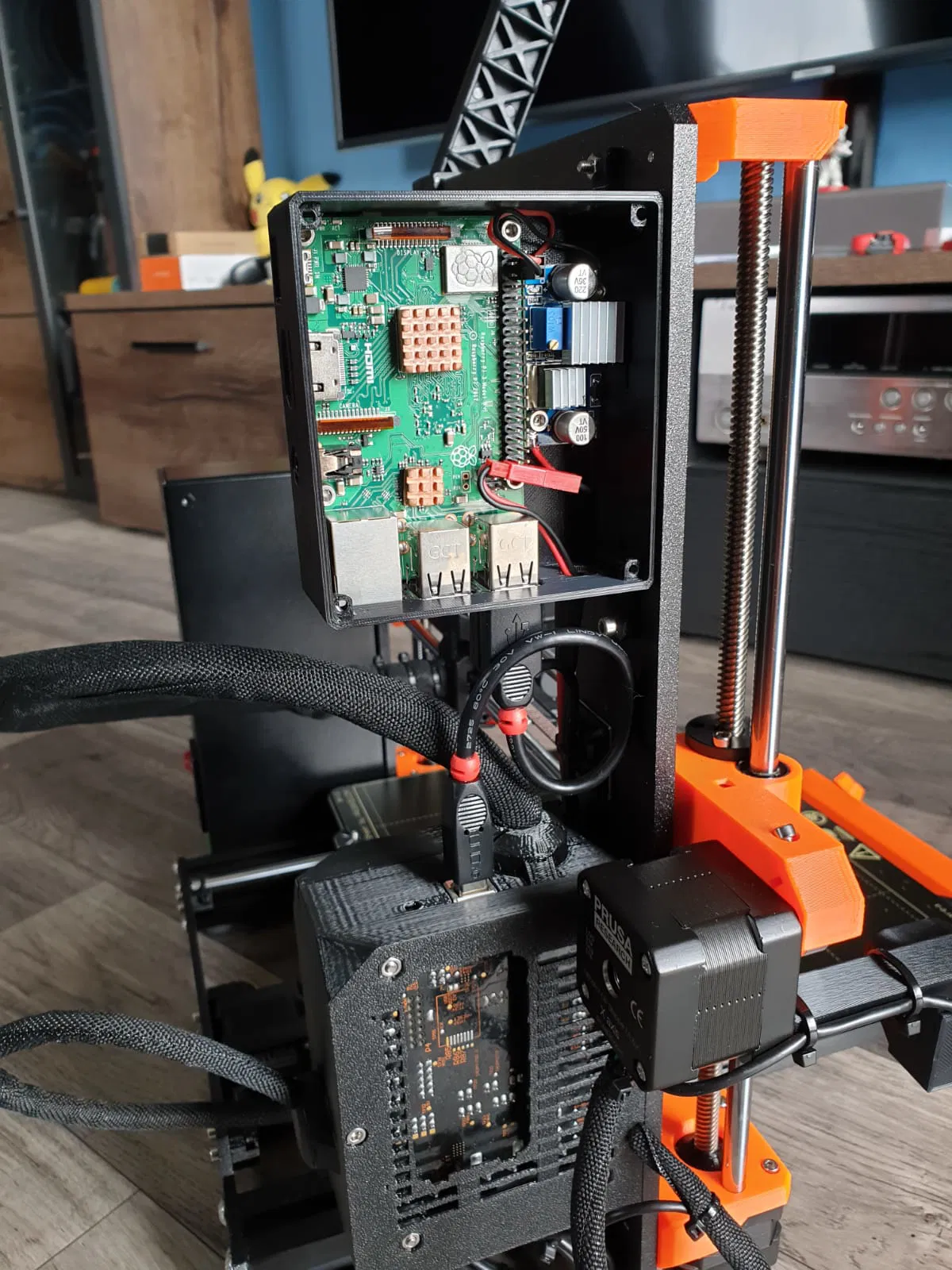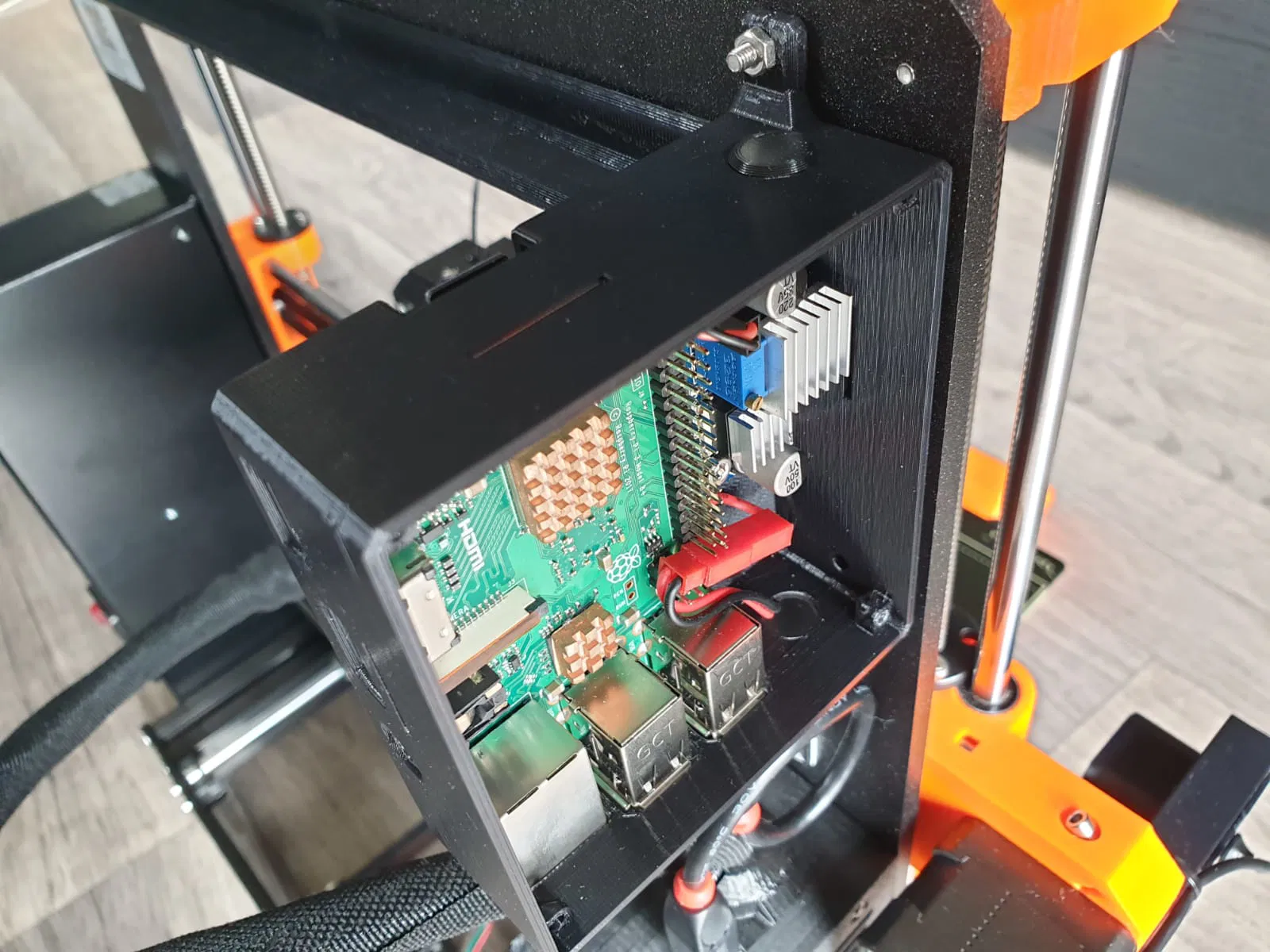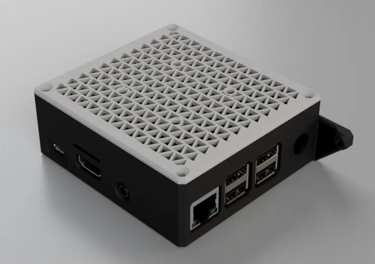 Vỏ bảo vệ cho Raspberry Pi hỗ trợ lắp kèm bộ hạ áp (Buck Converter) để lấy nguồn trực tiếp từ máy in MK3S. Thiết kế thông minh với khớp cài chắc chắn, có tùy chọn bắt vít và hỗ trợ lắp quạt tản nhiệt 40mm tiện lợi.
