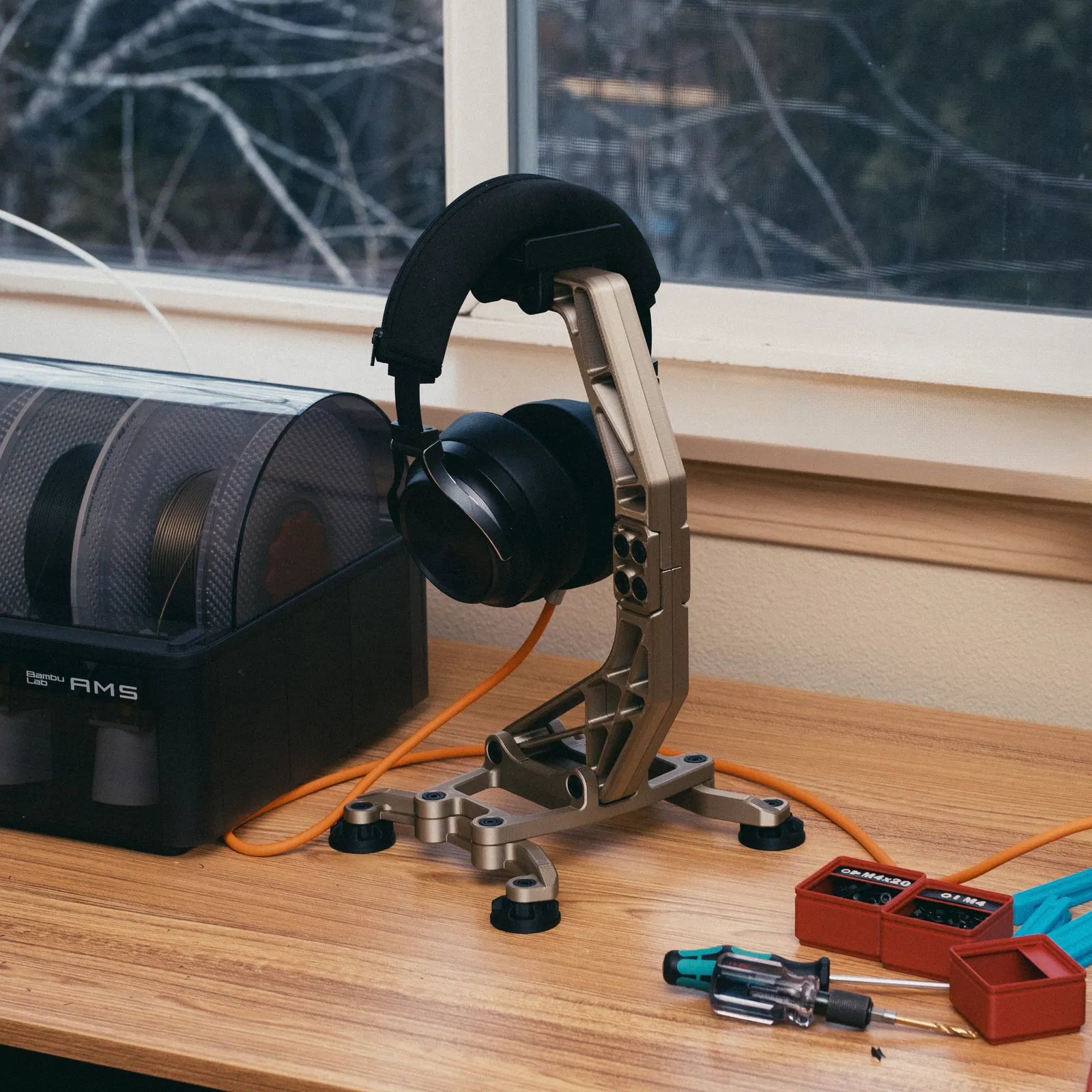 Mình đã có thiết kế giá treo trước đây, nhưng nó không phải lúc nào cũng phù hợp với các loại tai nghe kích thước lớn. Mình muốn một cái gì đó có phong cách công nghiệp hơn, vì vậy mình đã tạo ra thiết kế này.