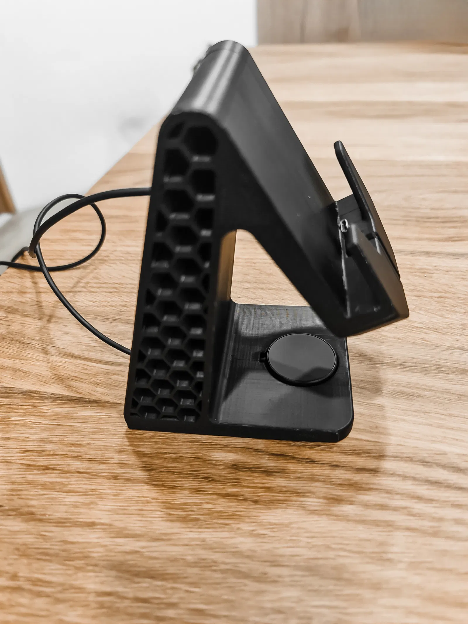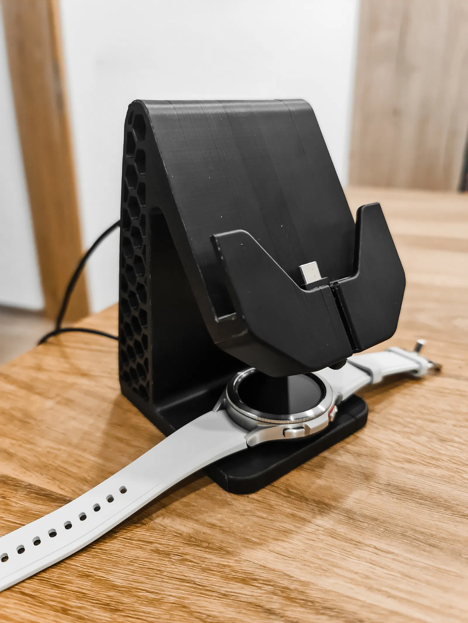 Mẫu đế tiện lợi giúp bạn vừa dựng điện thoại vừa sạc Galaxy Watch cùng lúc. Thiết kế đi dây ẩn gọn gàng, hỗ trợ điện thoại dùng ốp lưng dày tới 12mm. Có sẵn tùy chọn file kèm support hoặc không để bạn dễ dàng in ấn.