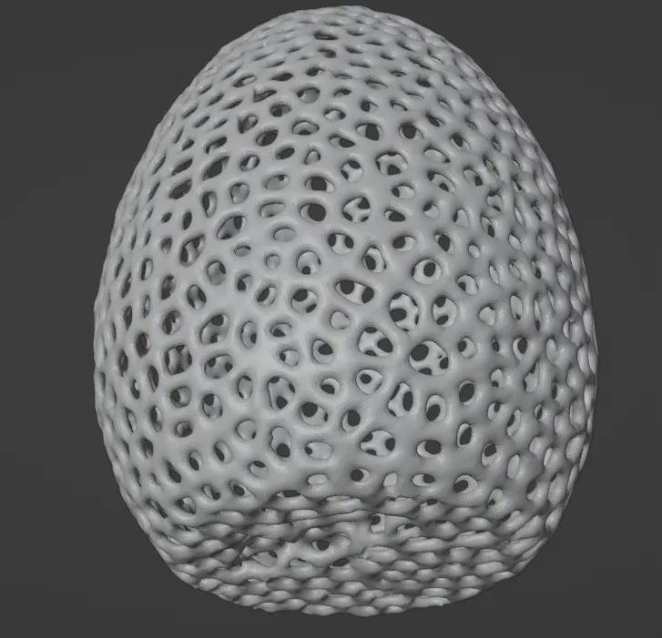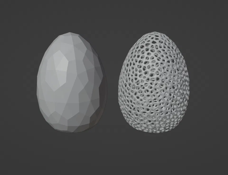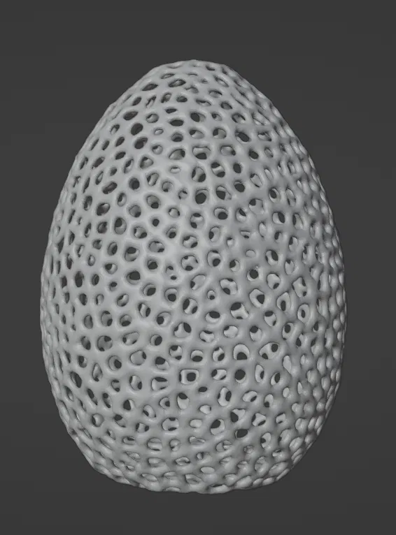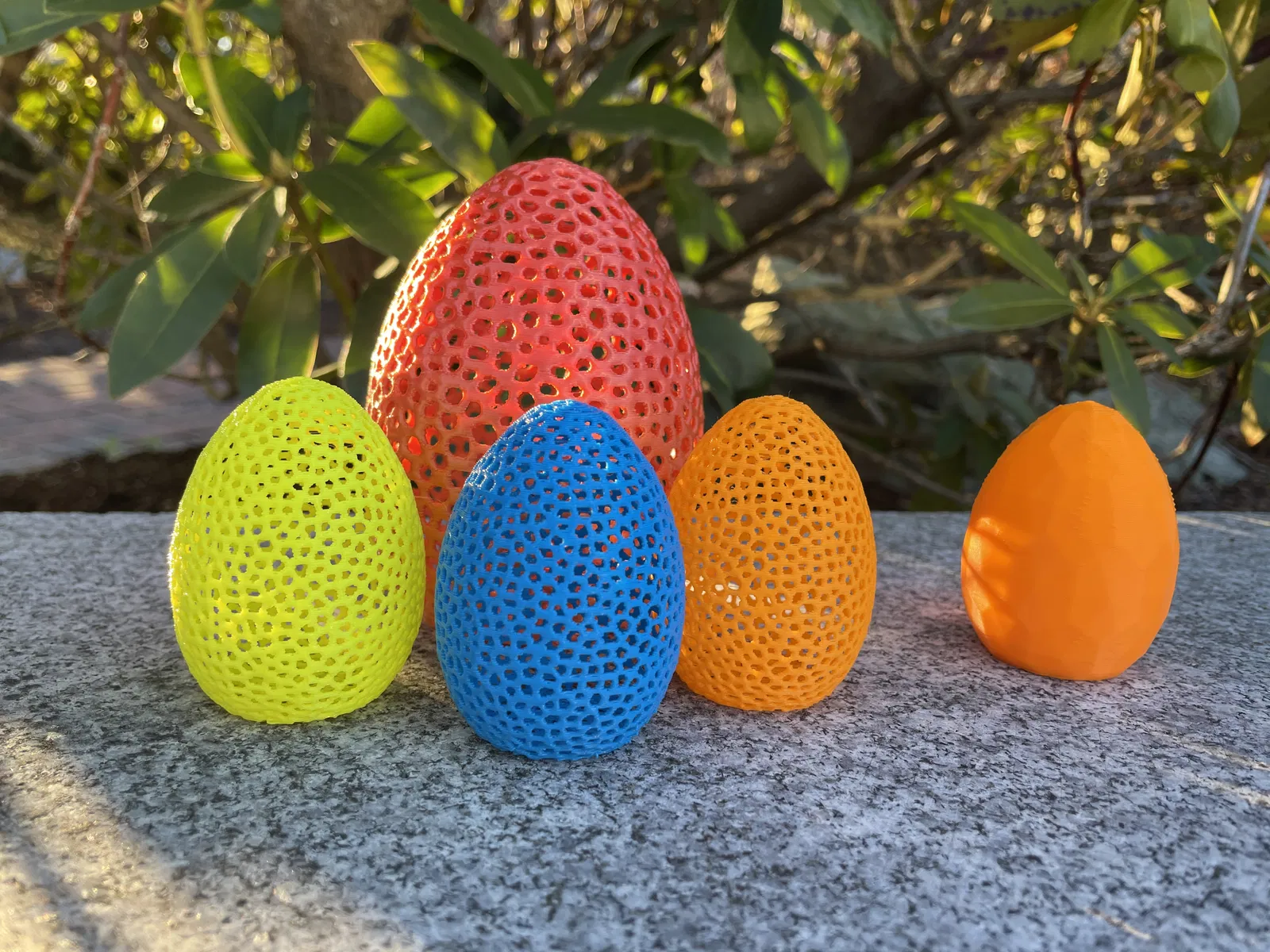 Mô hình trứng dễ in cùng với một phiên bản Voronoi của cùng mẫu đó. Đối với mô hình Voronoi, bạn nên hạ thấp nhẹ trục Z offset trong phần mềm slicer để giúp mô hình bám vào bàn in tốt hơn, và nhớ in với 100% infill để tăng độ chắc chắn nhé. Không cần dùng support.