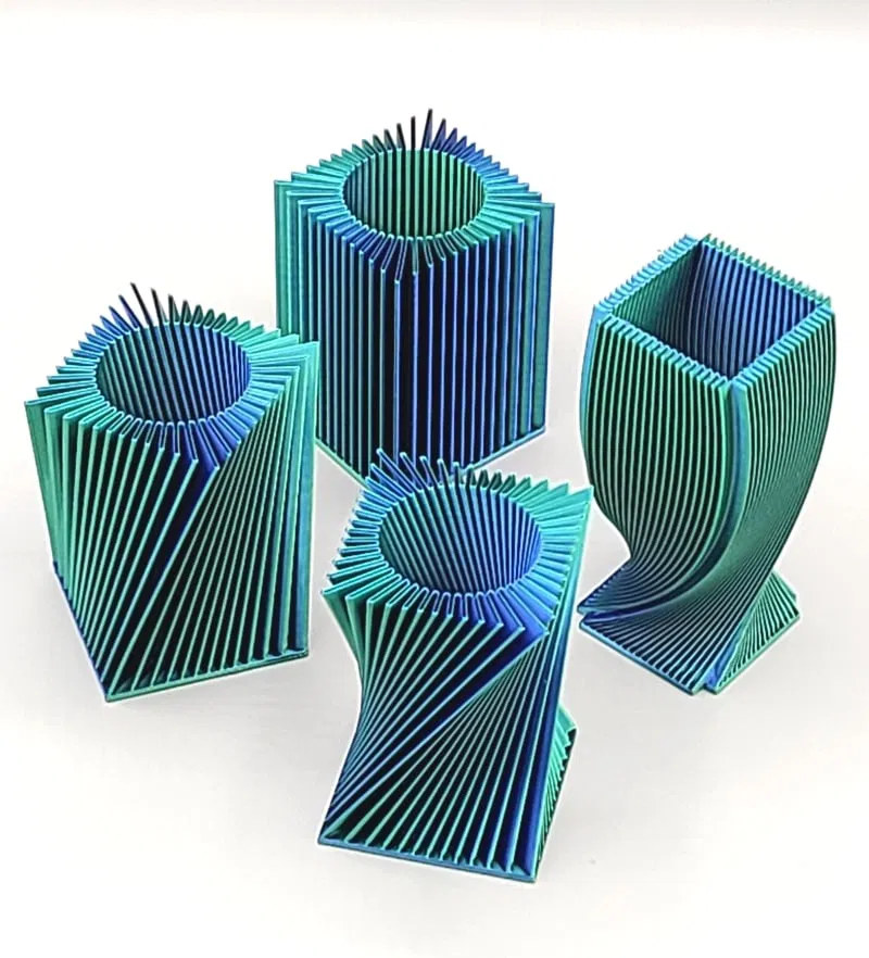 Cách đây một thời gian mình có thiết kế một mẫu bình hoa dẻo nhưng chưa đăng. Mình nghĩ thiết kế thêm một vài mẫu tương tự với chất liệu nhựa dual color silk chắc sẽ đẹp lắm, thế là cho ra đời bộ sưu tập này. Có bốn phiên bản khác nhau, một loại cao 102mm và các loại còn lại cao 77mm. Mọi người có thể tùy ý phóng to hay thu nhỏ tùy thích nhé. Phần đáy được thiết kế đặc. Các mẫu này được thiết kế để in bằng kỹ thuật single wall (tường đơn).