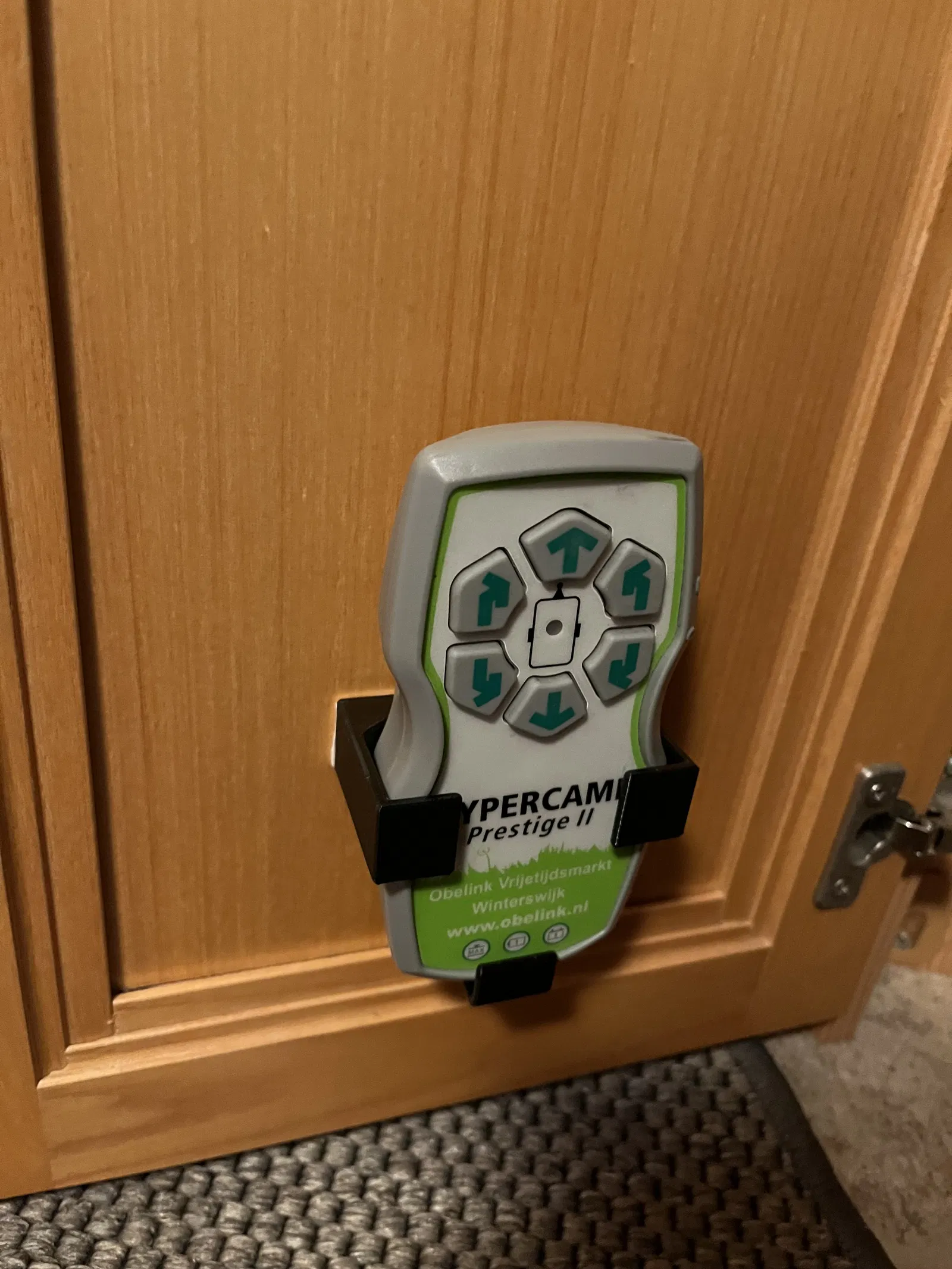 Giá treo tường dùng để cất giữ remote điều khiển Mover HyperCamp. Thiết kế gọn gàng, tiện lợi, dễ dàng lắp đặt trong caravan bằng băng keo hai mặt. Thích hợp in bằng nhựa PLA, PETG.