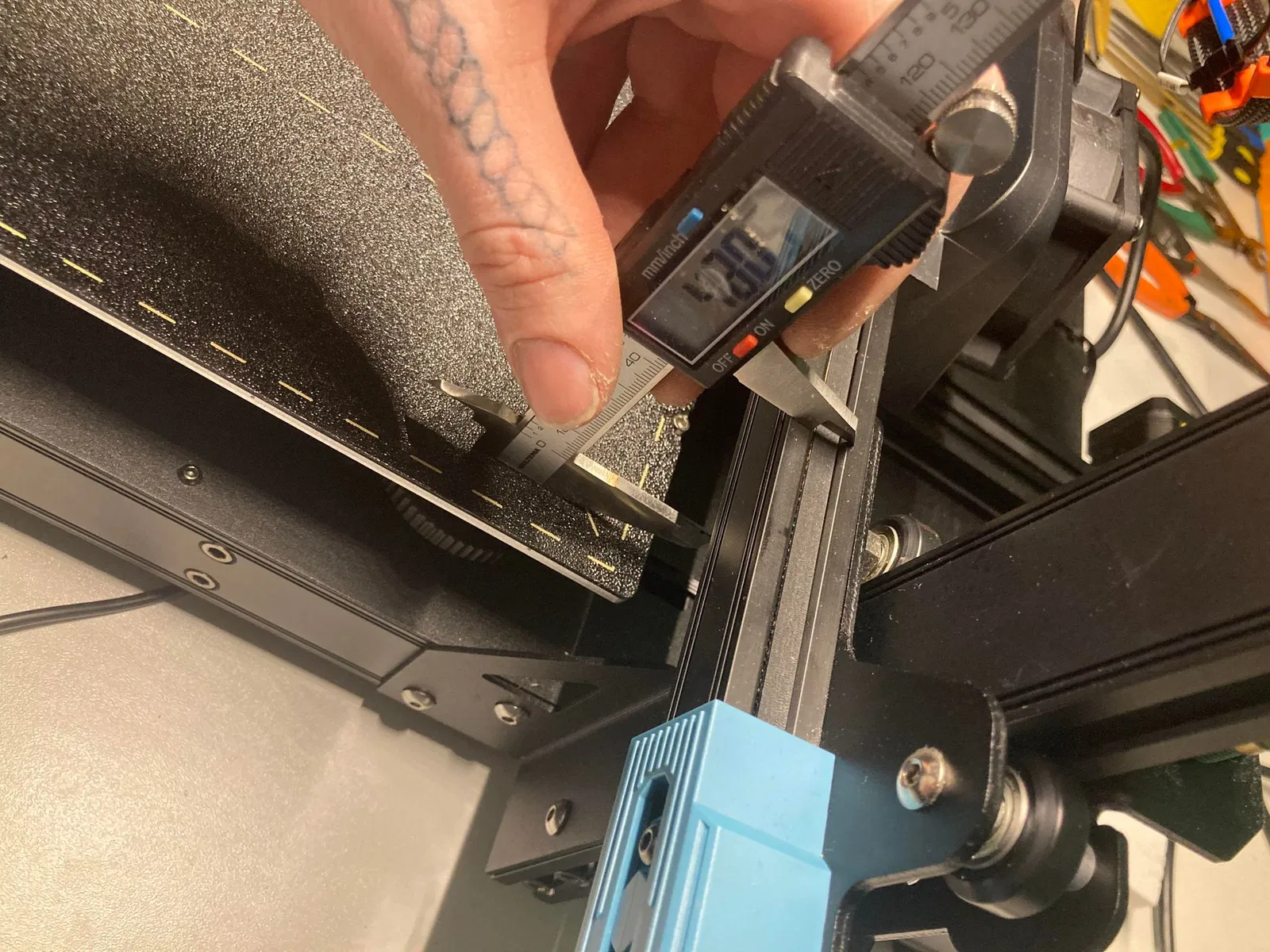 Tiến hành Home máy in. Khi "homing all" hoàn tất, ĐỪNG tắt motor!! Dùng thước kẹp đo khoảng cách từ đế máy đến phần trên của thanh trượt X (xem hình 1). Bắt đầu từ phía bên trái và ghi lại số đo. (Hãy giữ thước thật thẳng và đo ít nhất hai lần).