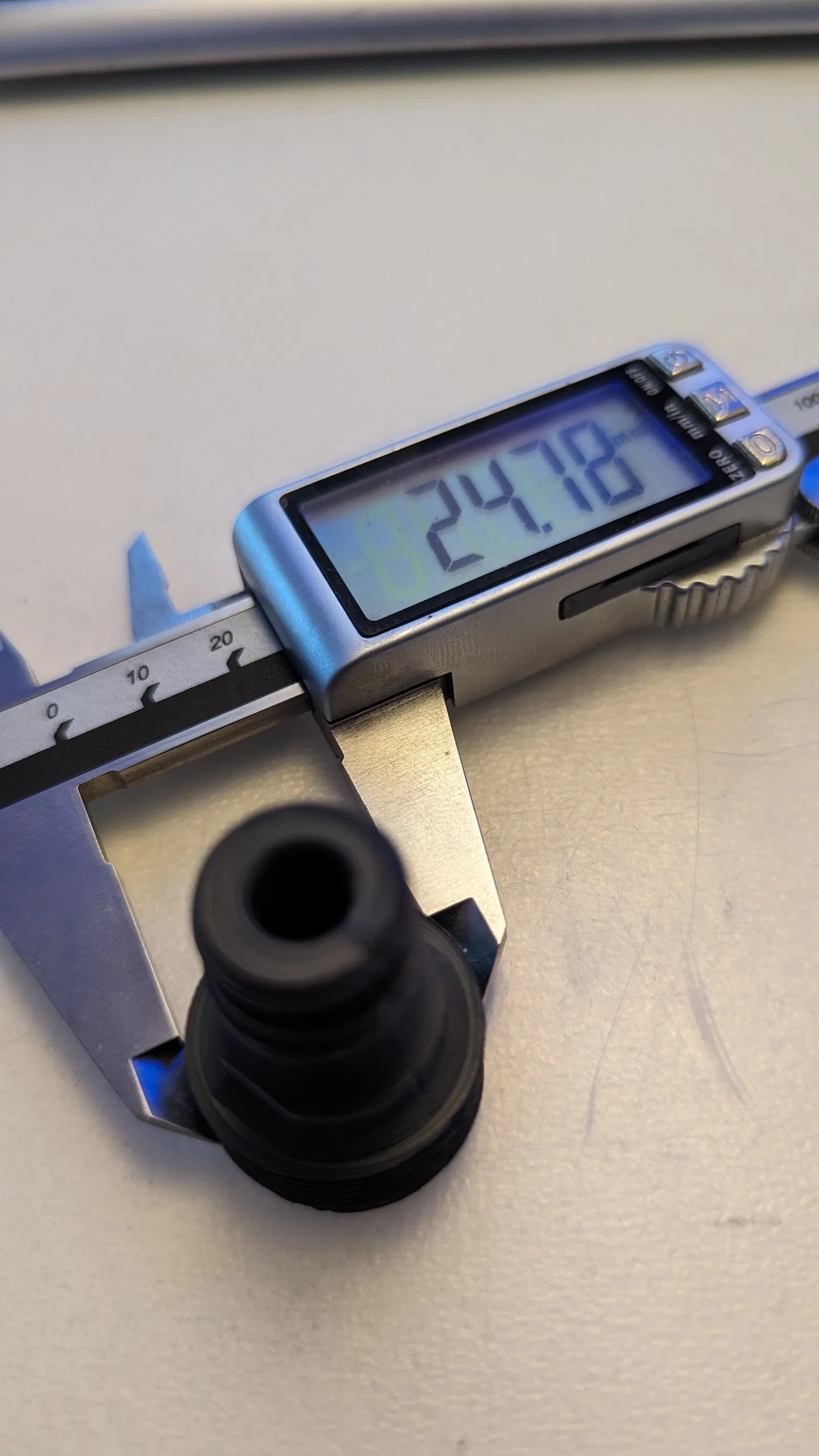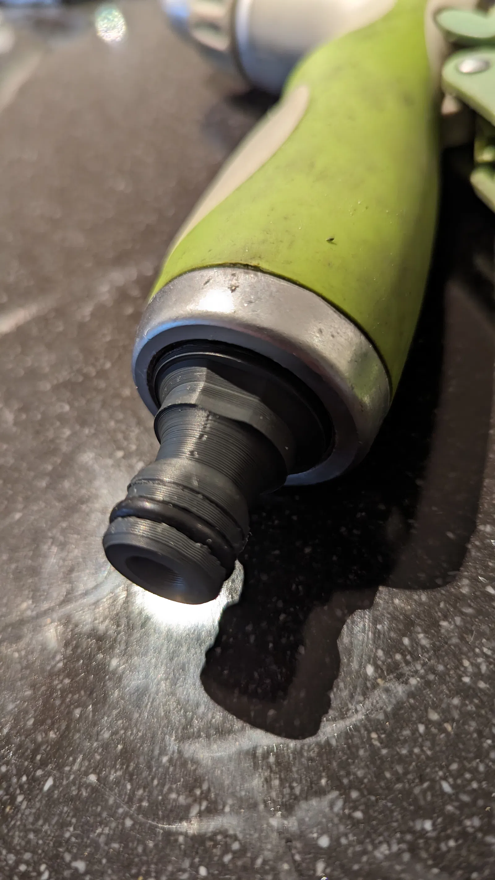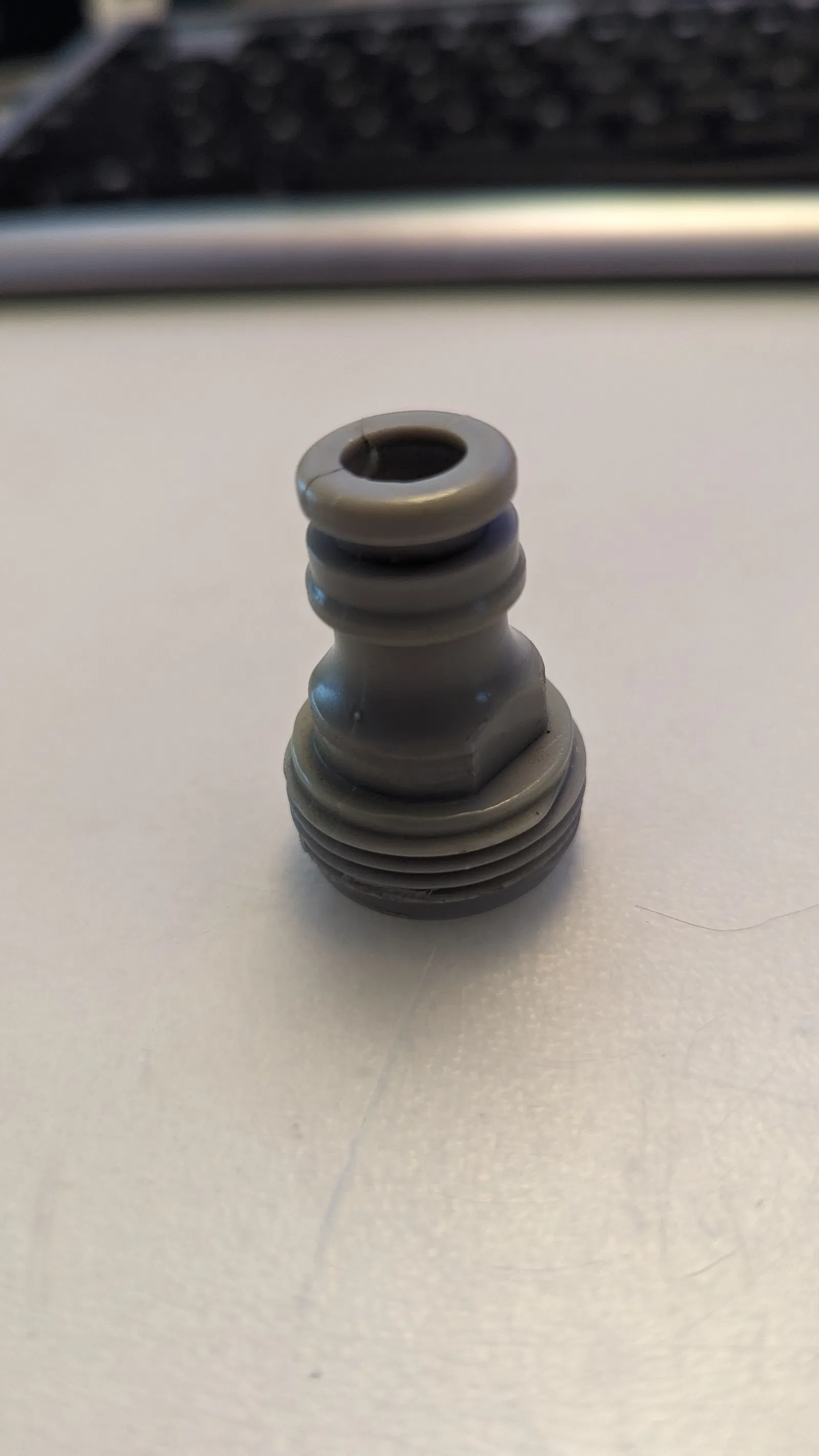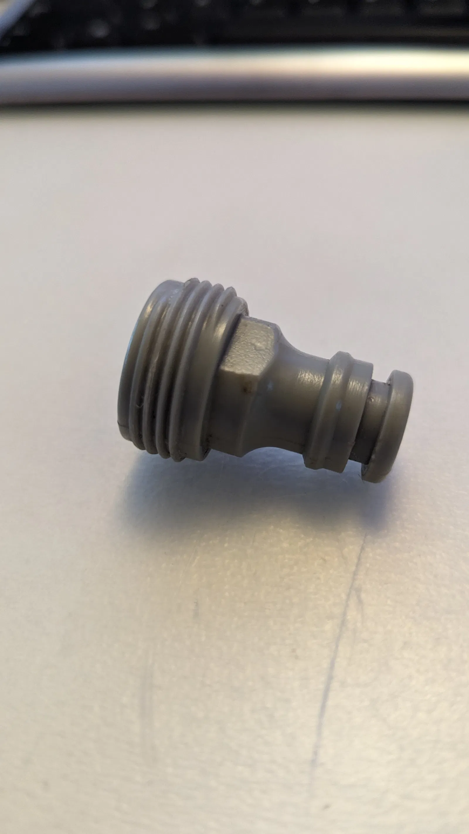 Cái đầu nối ren Gardena (màu xám nhạt) cũ trên súng phun nước của mình bị nứt và rò rỉ nước. Thế là mình nhảy vào Fusion, đo đạc rồi in thử vài lần và cuối cùng ra được cái này đây.
